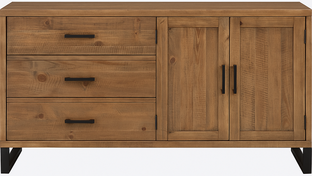 The Pembroke 2+3 Sideboard in Rustic Pine/Black is a versatile storage solution with a touch of rustic charm. Featuring two cupboards and three drawers, this sideboard provides ample storage for a variety of household items. Crafted from rustic pine with a warm finish and complemented by sleek black metal legs, it complements both modern and traditional decors.