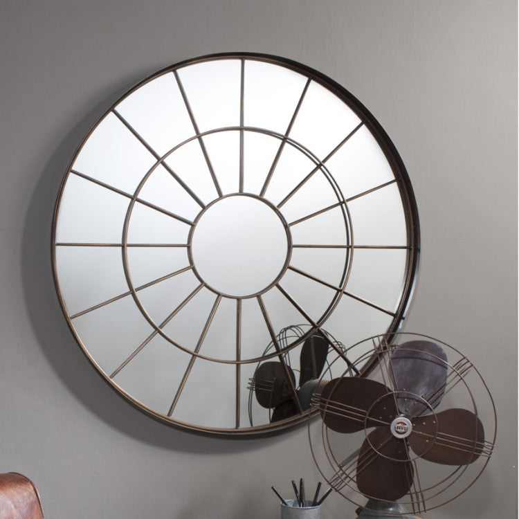 Large round chic industrial window mirror with a bronzed effect metal frame. -