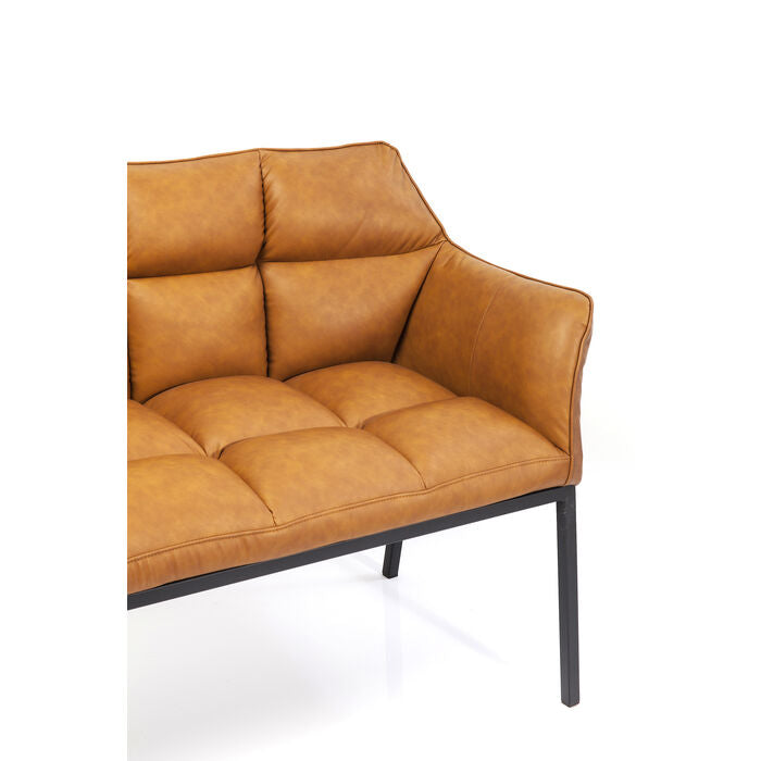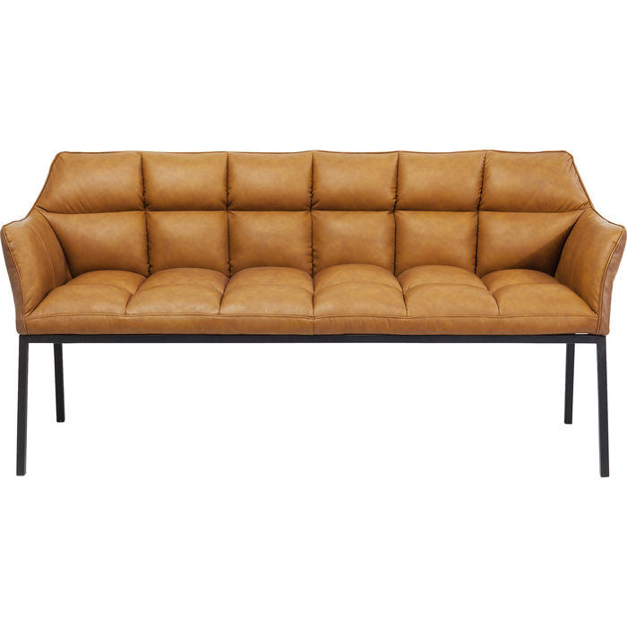 Why aren t all benches upholstered, is what you ll ask yourself once you ve taken a seat on Thinktank. And in spite of the upholstery, the bench doesn t look over-stuffed. Slender legs, a clear square quilted pattern and slightly flared padded armrests give it a modern lightness. The soft toffee brown and warm leather look create a pleasant contrast to cool, shiny surfaces. It goes particularly well with matt black, warm earth tones, a touch of gold and dark wood.