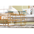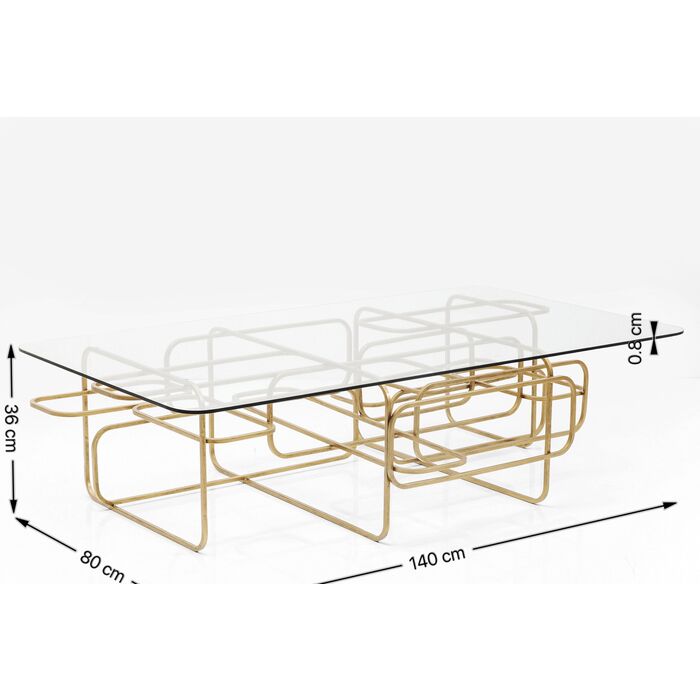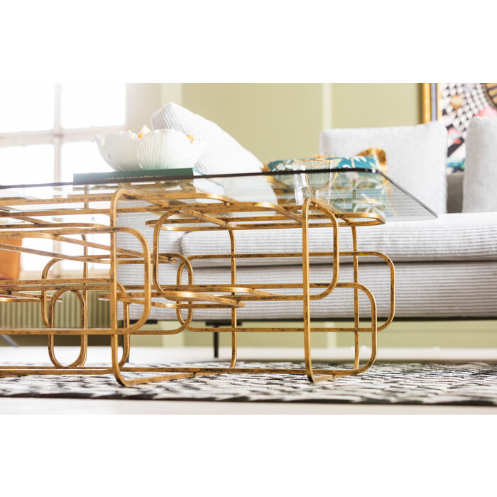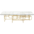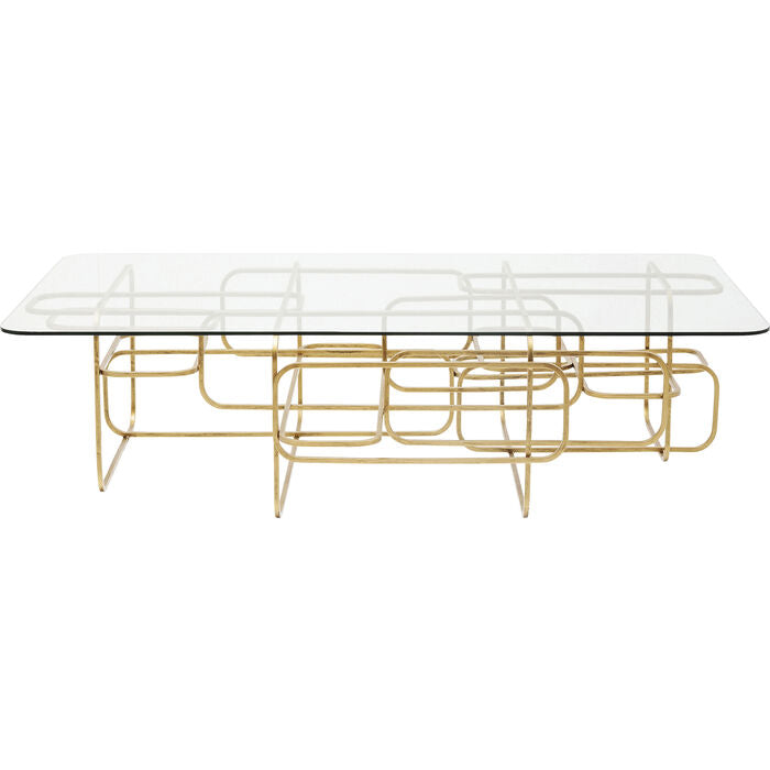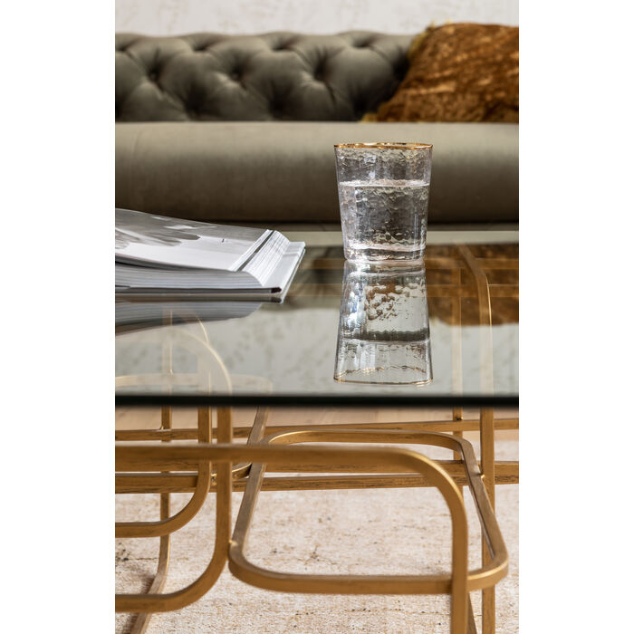 This rectangular coffee table with glass top and golden frame makes an impact with its modern elegance. Particularly impressive is the construction below the top, which shows graphic patterns. Also available in other versions.