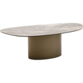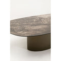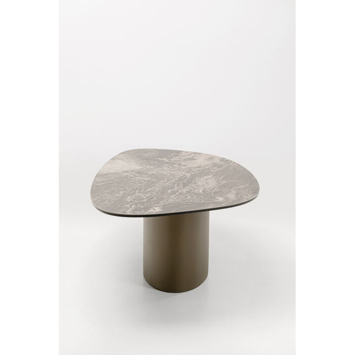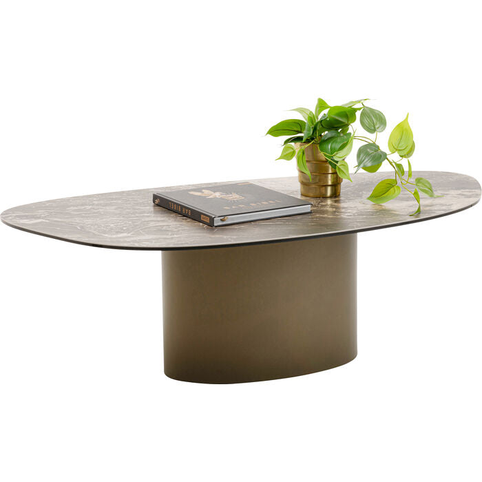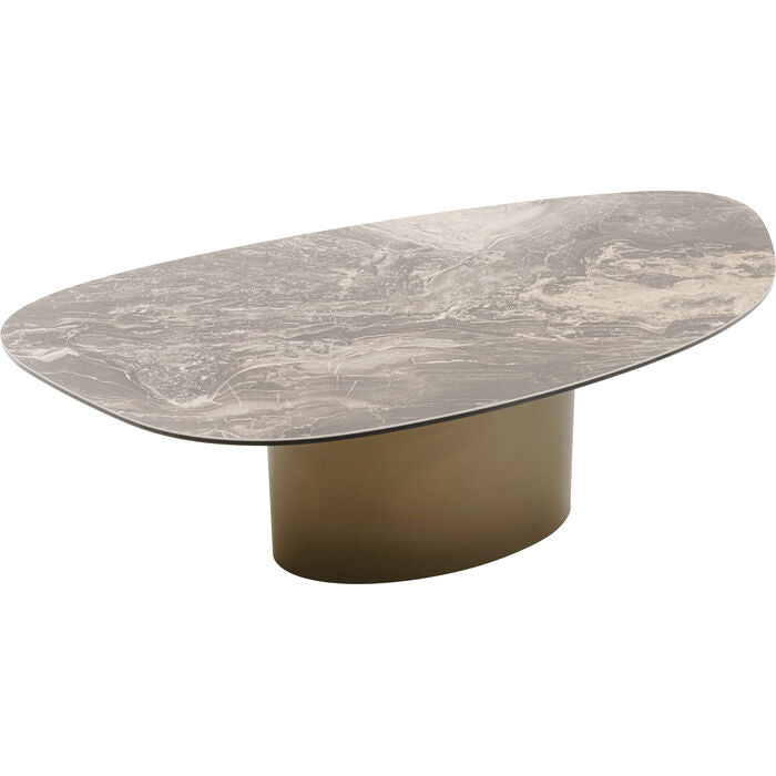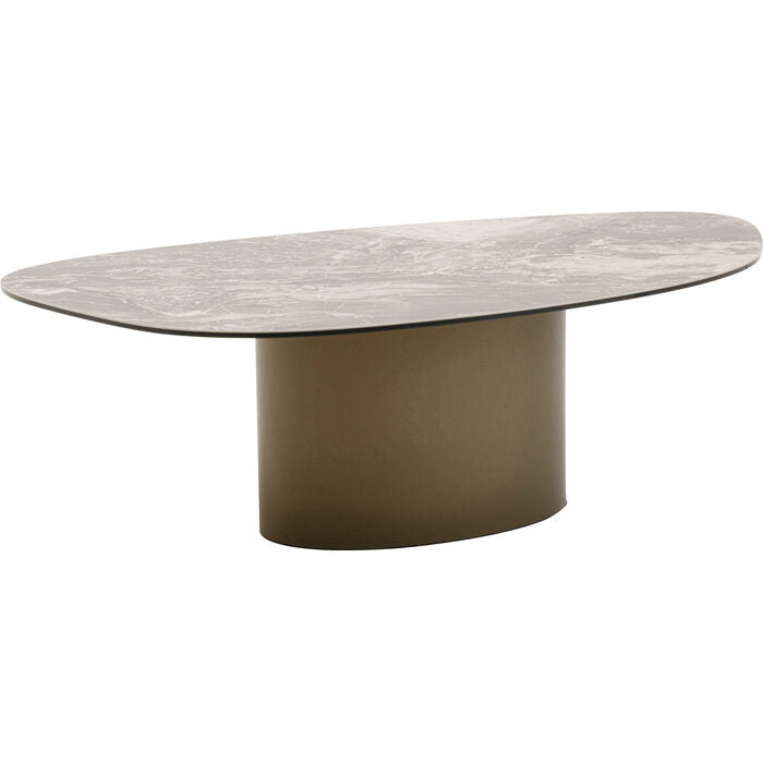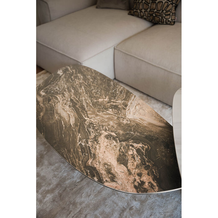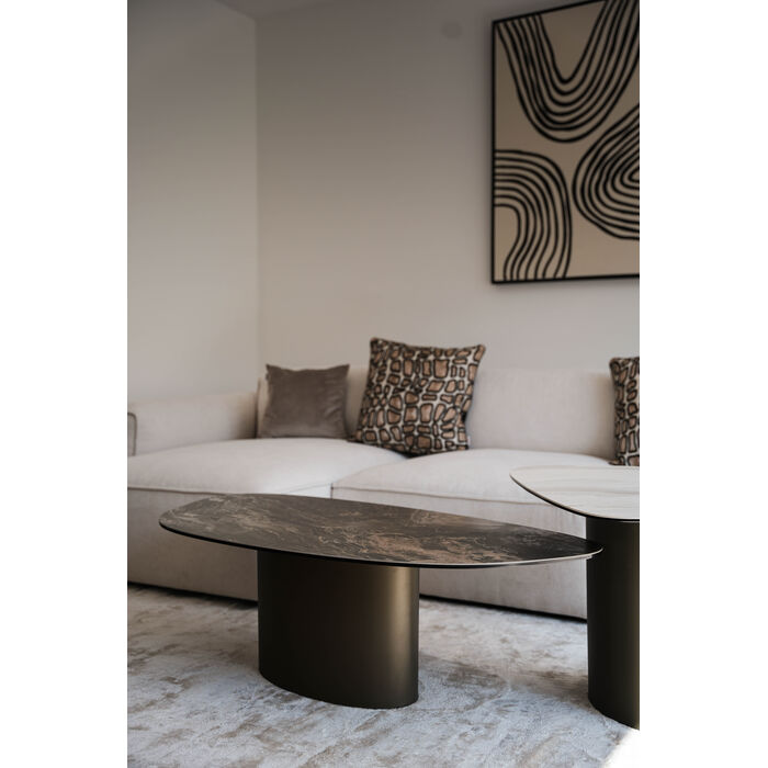 A statement piece with gallery character: this coffee table combines sculptural elegance with functional design. The organically curved top made of finely marbled ceramic lends the room a luxurious touch and attracts everyone s attention. The centrally positioned base made of powder-coated steel not only provides stability, but also creates an exciting contrast to the flowing shape. Ideal as a stage for design objects, as a stylish snack area or as the centerpiece of a modern living concept. The ensemble looks particularly harmonious with sofas in muted tones, textured textiles and statement lights in a metallic look. A work of art for the living room with functional added value.
