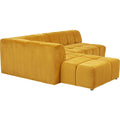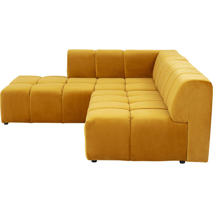 - Ochre-yellow corner sofa with chaise longue on the left and a velvety cover made of easy-care synthetic fibre