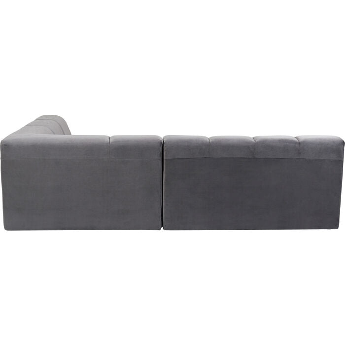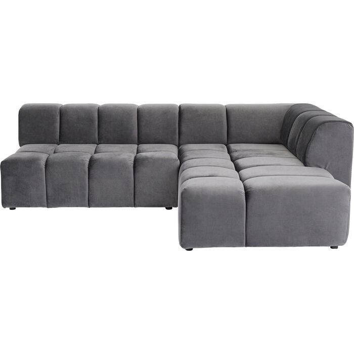- Grey corner sofa with chaise longue on the right and a velvety cover made of easy-care synthetic fibre
