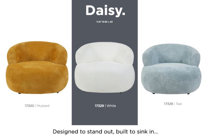 This chair is the ultimate design "hug" for your home. With its bold, marshmallow-like curves and vibrant personality, it turns any empty corner into a cozy destination. The Daisy accent chair brings maximum texture and a sunny, optimistic energy to your living space. Its ultra-rounded, oversized silhouette is inspired by high-end contemporary lounge design, prioritising both visual impact and pure, sink-in comfort. in mustrad or white or teal!