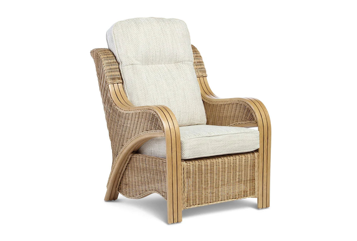Designed to enhance any conservatory or living space, this exquisite chair features a light oak wash finish and sweeping triple laminated rattan arms that provide unparalleled comfort and style.