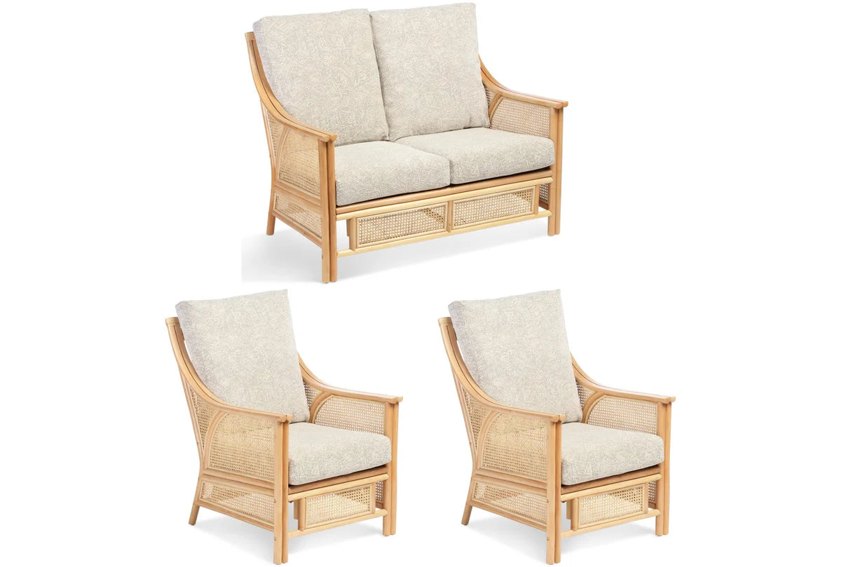 The De Retsehc Natural Cane 2 Seater Suite encapsulates both elegance and comfort, making it a perfect addition to any home. Featuring sweeping laminated arms and a modern chic design, this suite is hand-crafted from natural rattan. The open mesh cane webbing panels with cut-out details at the back and the tied rattan strip detailing enhance its aesthetic appeal, while the robust construction ensures durability.