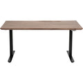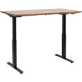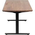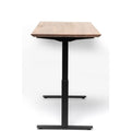 - A rectangular, electrically height-adjustable desk with a solid 3.5 cm thick oak top and lacquered steel frame in black