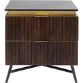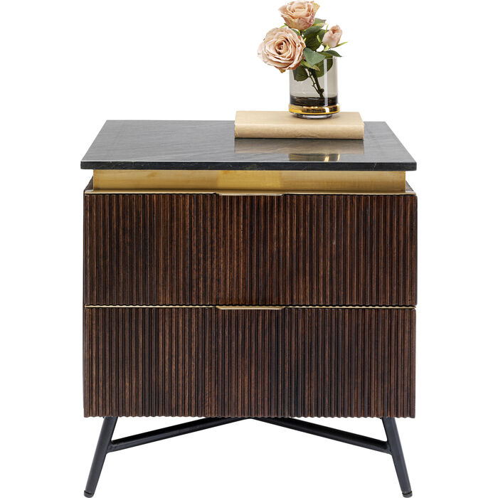 With great attention to detail everything has been thought of in this small chest of drawers. This luxurious piece of living room furniture is without a doubt in a class of its own. The elegant, dark lacquered mango wood harmonises well with the top made of dark mineral marble and the black metal legs. What makes the bedside table above all incomparable and a special eye-catcher is the golden base with brushed brass, which is located between the top and the strikingly grooved fronts. Storage space is provided by two spacious drawers. The flat handles ensure easy opening and make the wooden chest of drawers look especially elegant.