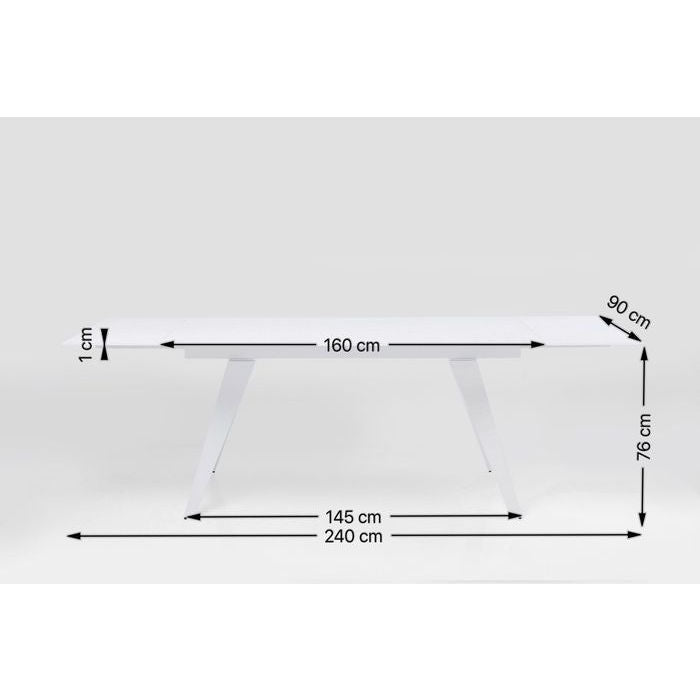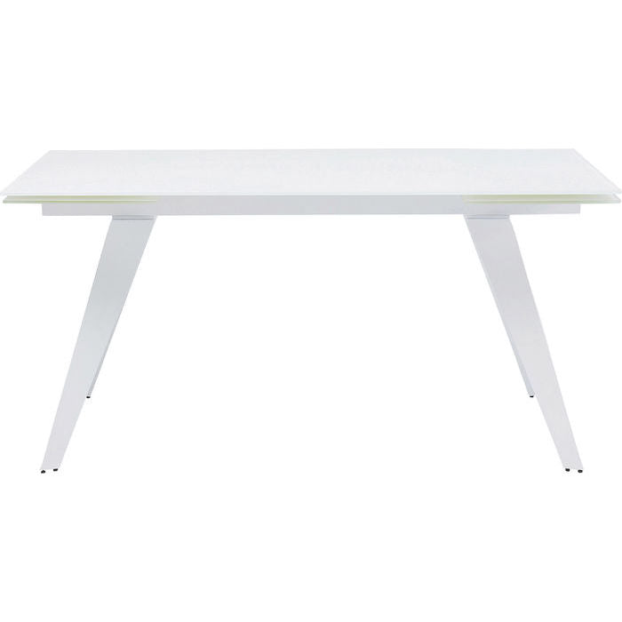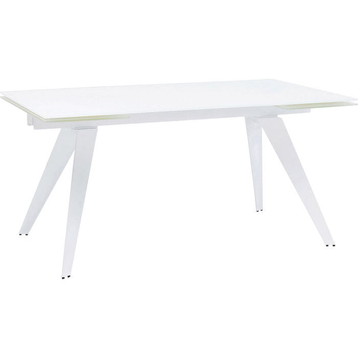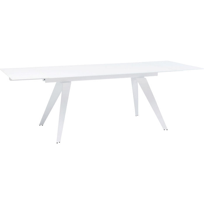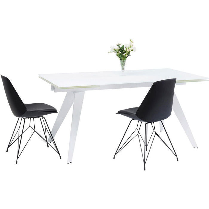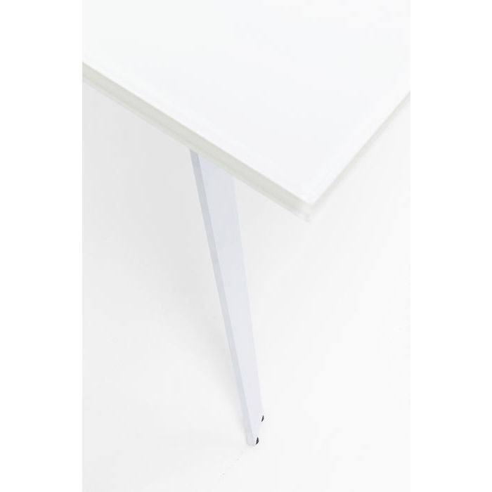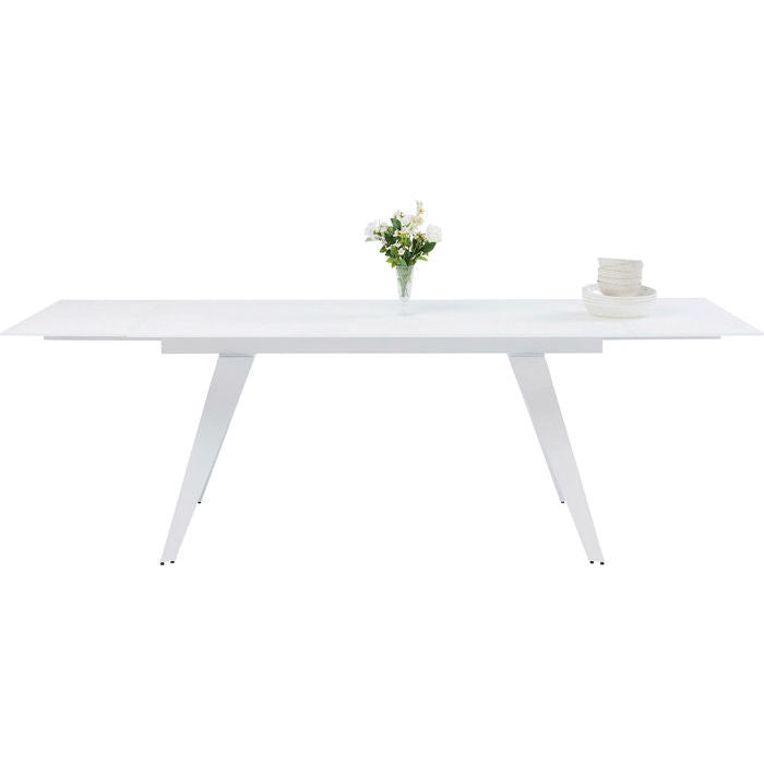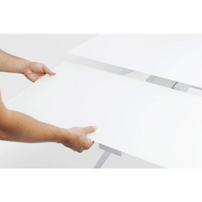 This is real hospitality: a dining table that turns into a long festive board when needed. Because it is completely white and has a ceramic-coated glass top, it looks inviting even without a tablecloth and lot of decorations. Its steel base is not only very stable, but also promises maximum legroom.