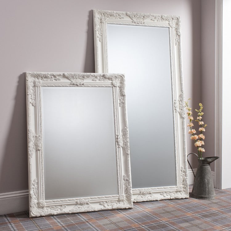 Pretty baroque style wood framed mirror in a painted matt cream finish. -