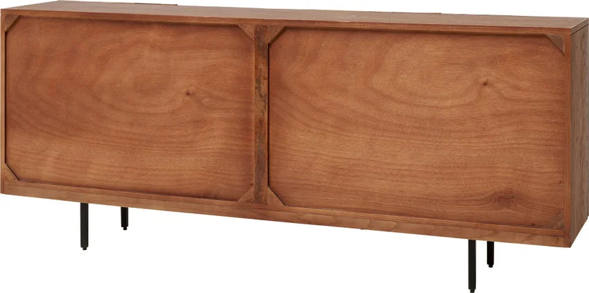 Behind the four generous compartments there is plenty of space for crockery, décor or technology. With its smooth soft-close function, every opening and closing becomes a luxurious experience – ideal for any modern home that combines functionality with style. Material: (Body and fronts: lacquered Mango solid wood, back panel: medium-density fibreboard lacquered, top panel: medium-density fibreboard veneered, foot/feet: powder-coated steel, shelf: 2 pieces medium-density fibreboard veneered, door: 4 pieces mango solid wood lacquered)