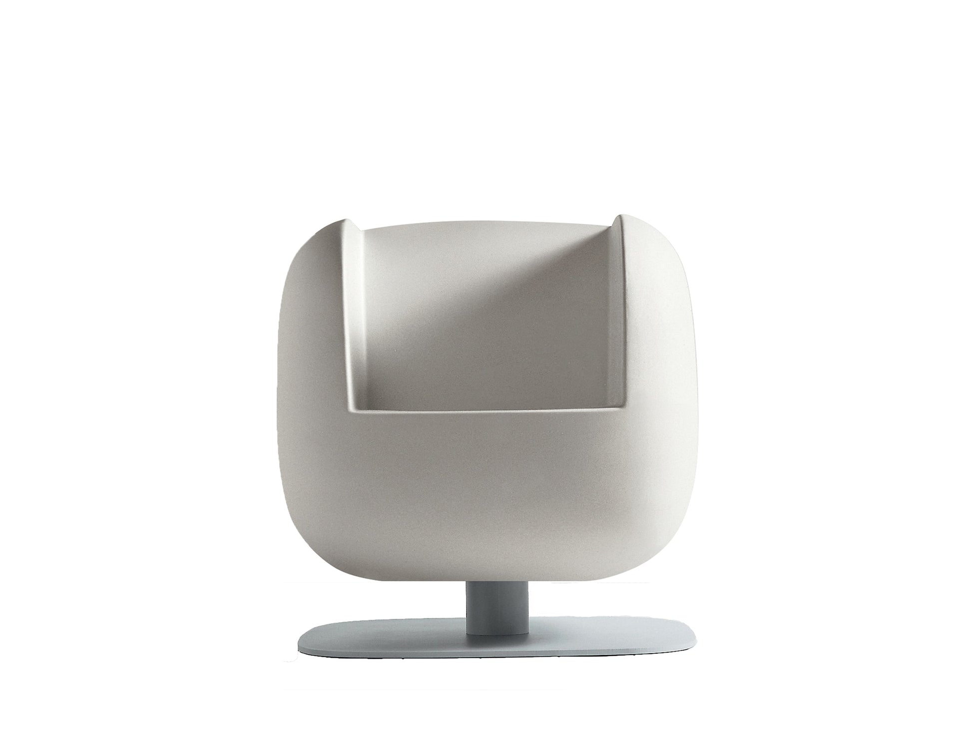Big Jim is the armchair designed by Stefano Getzel for Luxy. A witty and informal complement, characterized by an unusual shape and composition. With a seat almost dig in a monolithic of polyethylene, available in white, grey or black, Big Jim is supported by a solid stem base, made of painted or stainless steel. You can choose among a fixed or swivel with self-aligning system base. The armchair can be used outside with the painted base, but only in covered outdoor spaces with the stainless steel one.