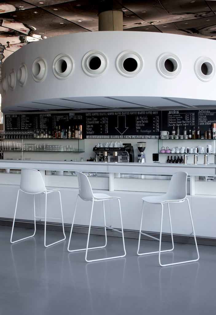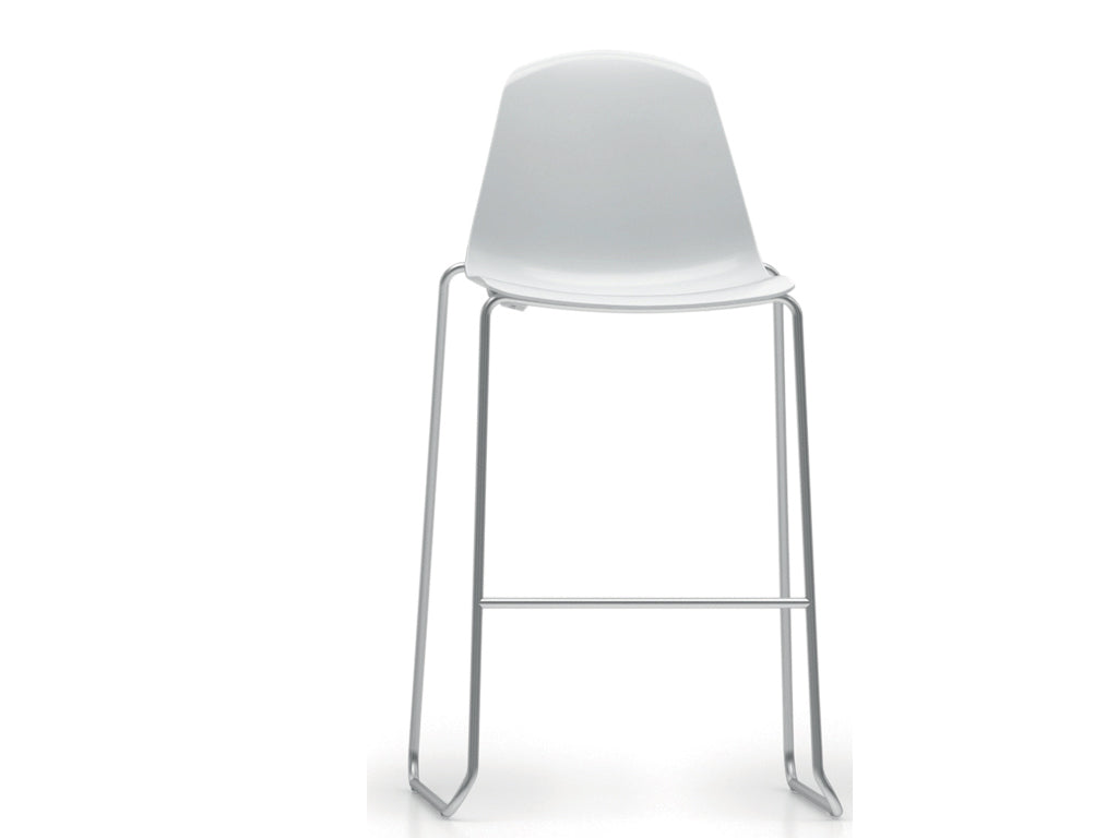 Fix stool with footrest, shell in polypropylene, black or white coated or chromed structure.