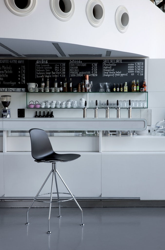 Swivel stoolwith footrest, shell in polypropylene, chromed in rod iron cantilever structure, with glides.