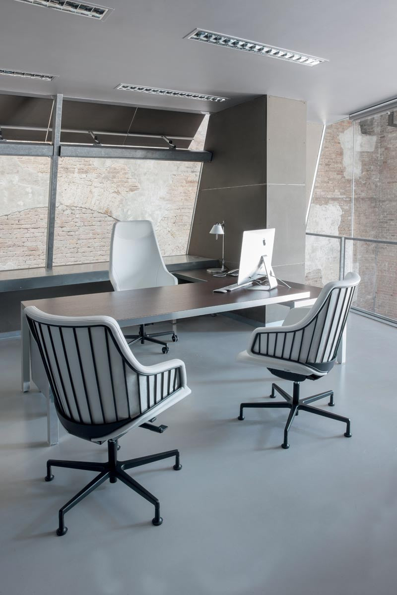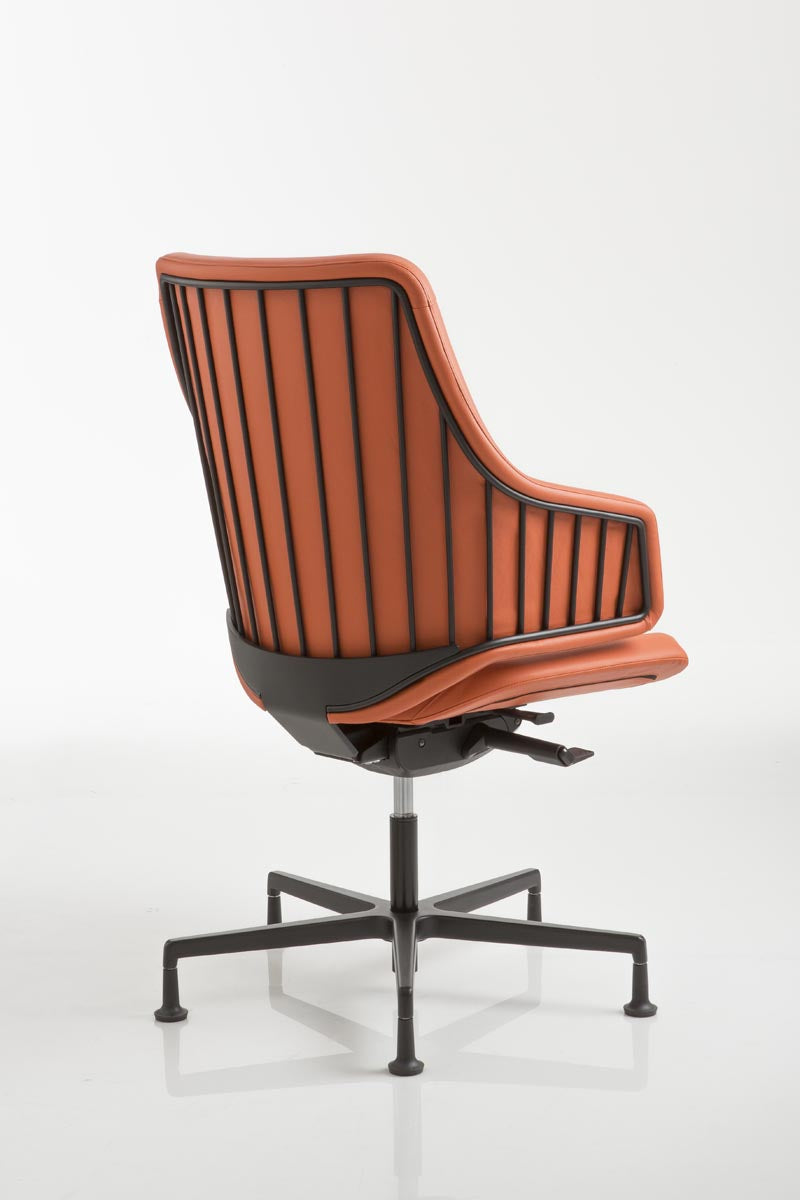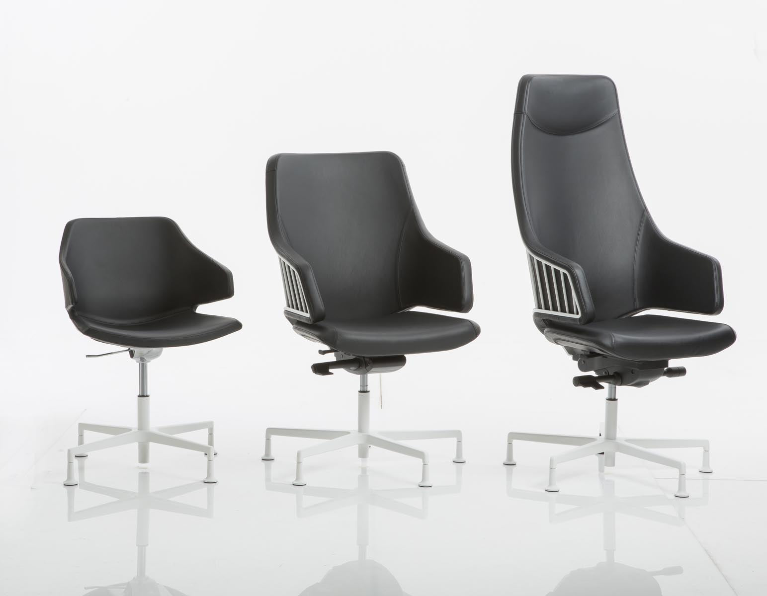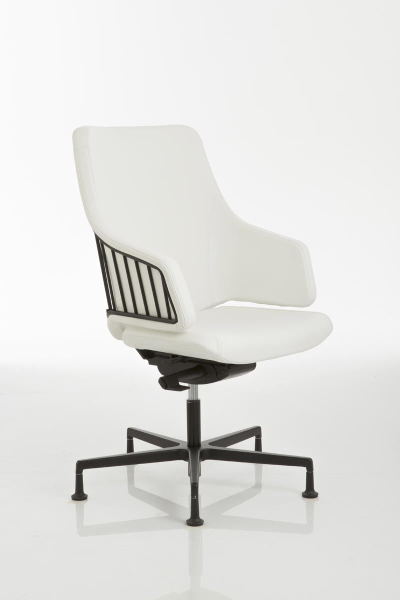 Executive, medium-high backrest, weight-sensitive, chromed structure with polished alu 5 star base, structure black painted with alu 5 star base black painted or structure white painted with alu 5 star base white painted. Standard glides matched to the color of the base.