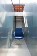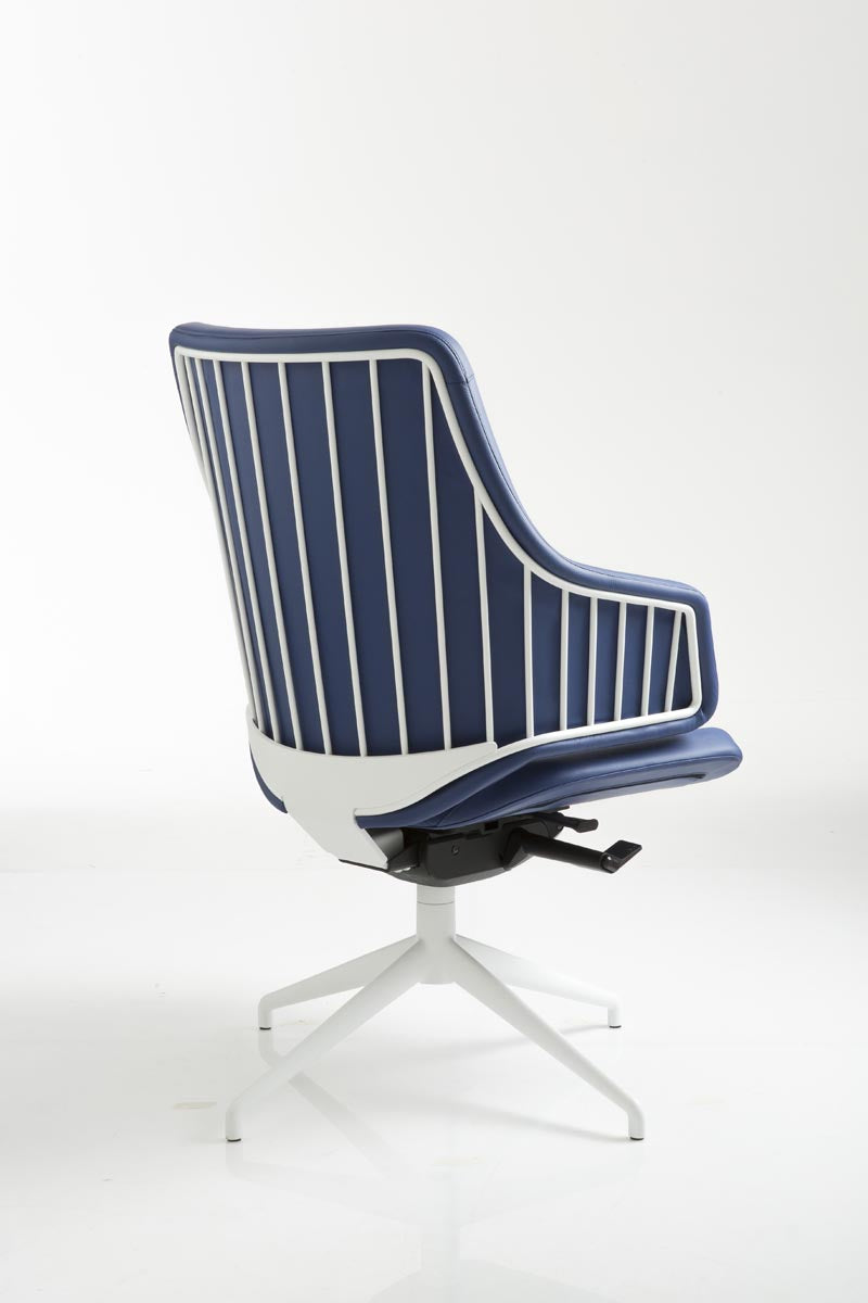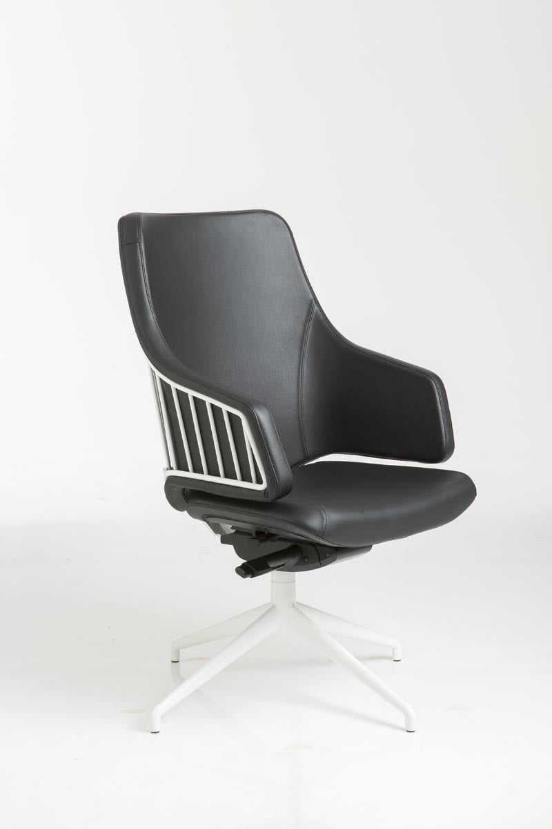 Executive, medium-high backrest, weight-sensitive, chromed structure with polished alu 4 star base, structure black painted with alu 4 star base black painted or structure white painted with alu 4 star base white painted. Standard glides matched to the color of the base.