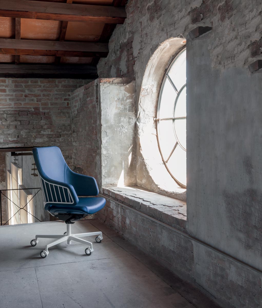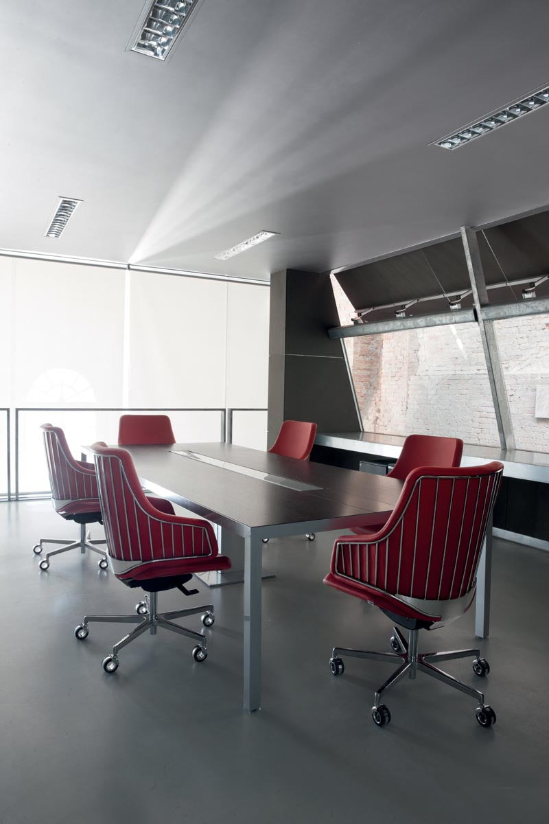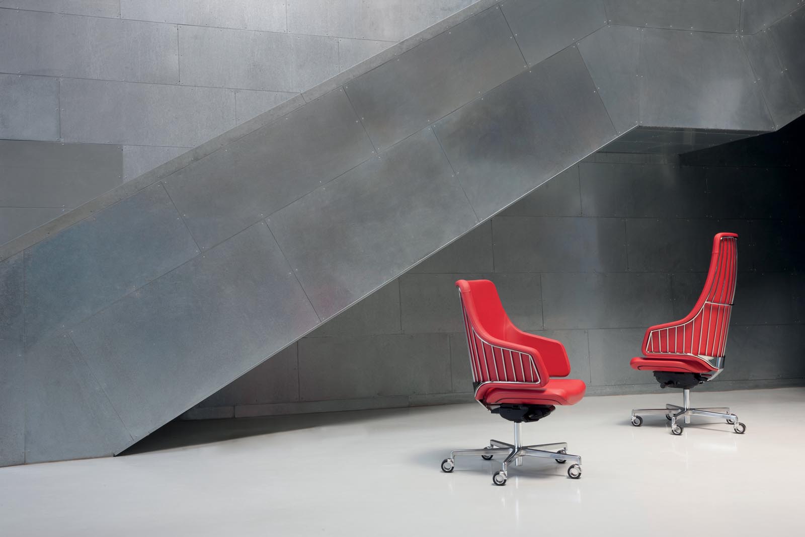 Executive, medium/high backrest, weight-sensitive, chromed structure with polished alu 5 star base, structure black painted with alu 5 star base black painted or structure white painted with alu 5 star base white painted. With castors matched to the color of the base.