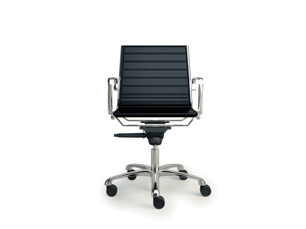 Light is one the Luxy's solutions for the office or home studio. A chair become a real Luxy production icon, a patent system immediately recognizable, functional and efficient. Frame is made of high resistant steel rod, onto is directly fixed the padding, without screws or evident fixing marks. A lightweight and resistant frame, that shapes a chair with an elegant and essential line, perfect in every modern or representative office, but also in a classic home office. The polyurethane foam padding ensures a great comfort and the wide range of coatings available let the Light chair fit in every place. This Light's version is equipped with a 5-spoke base made of polished aluminium with self breaking castors, adjustable in height with a gas plate system.