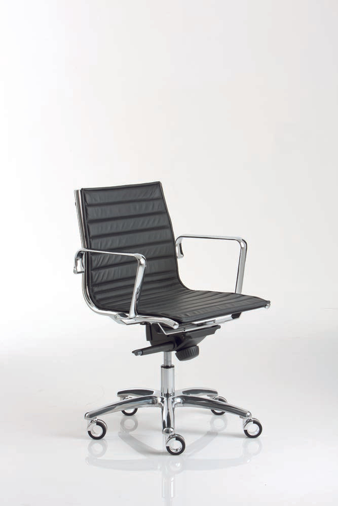 Executive, medium-high backrest, with chromed aluminum armrests, gas lift, tilt or decentrated multiblock mechanism, polished aluminum base.