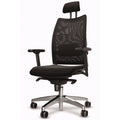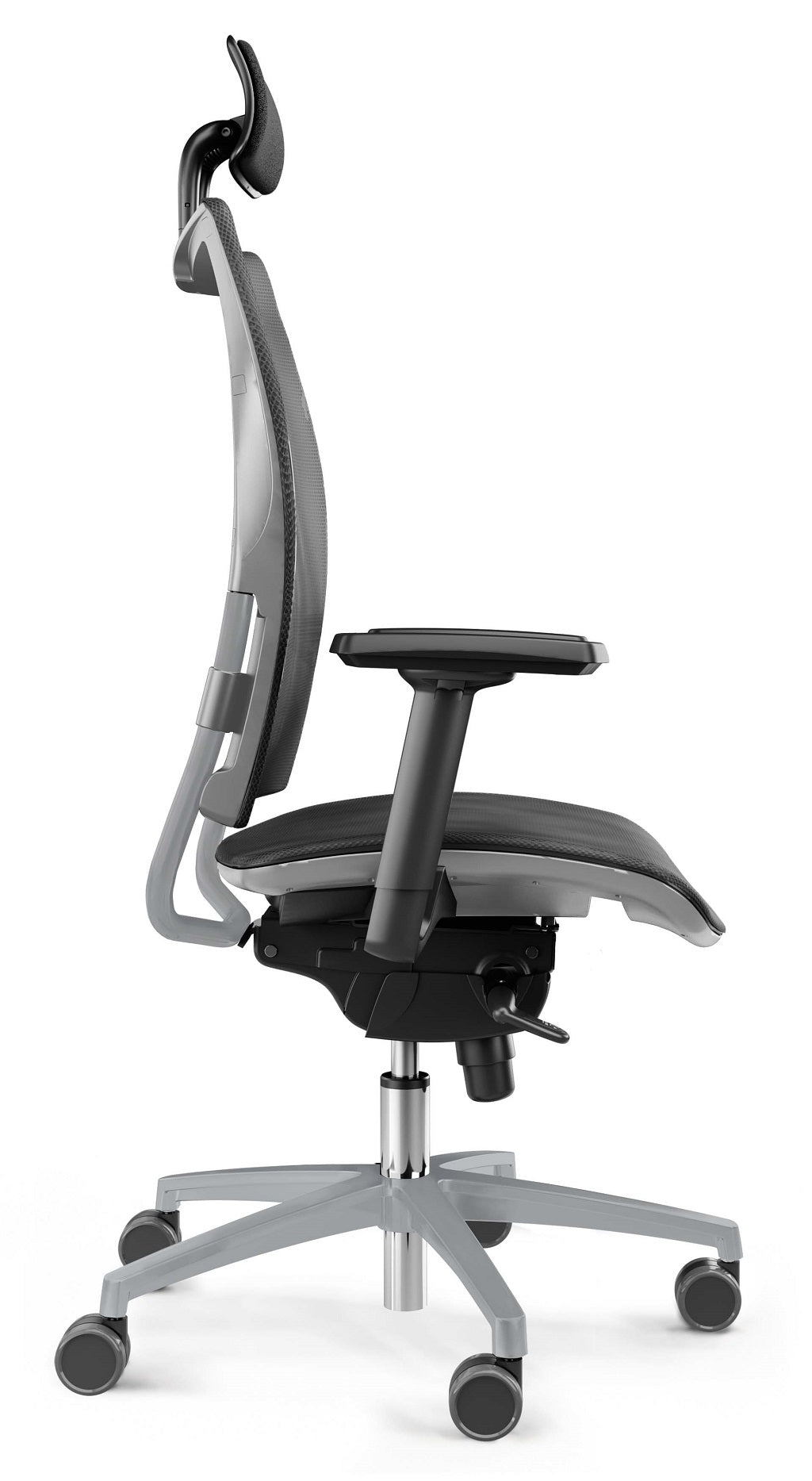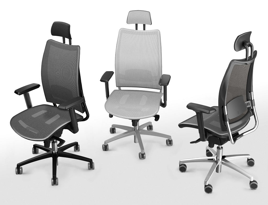 Executive, high backrest with adjustable headrest, synchro, mesh seat, chromed structure,polished aluminum base, black or grey plastic, silver grey coated structure, grey nylon base, grey plastic or painted black structure, black nylon base, black plastic, lumbar support, adjustable armrests 3D.