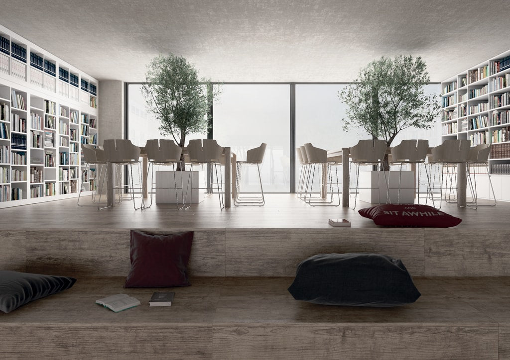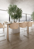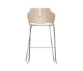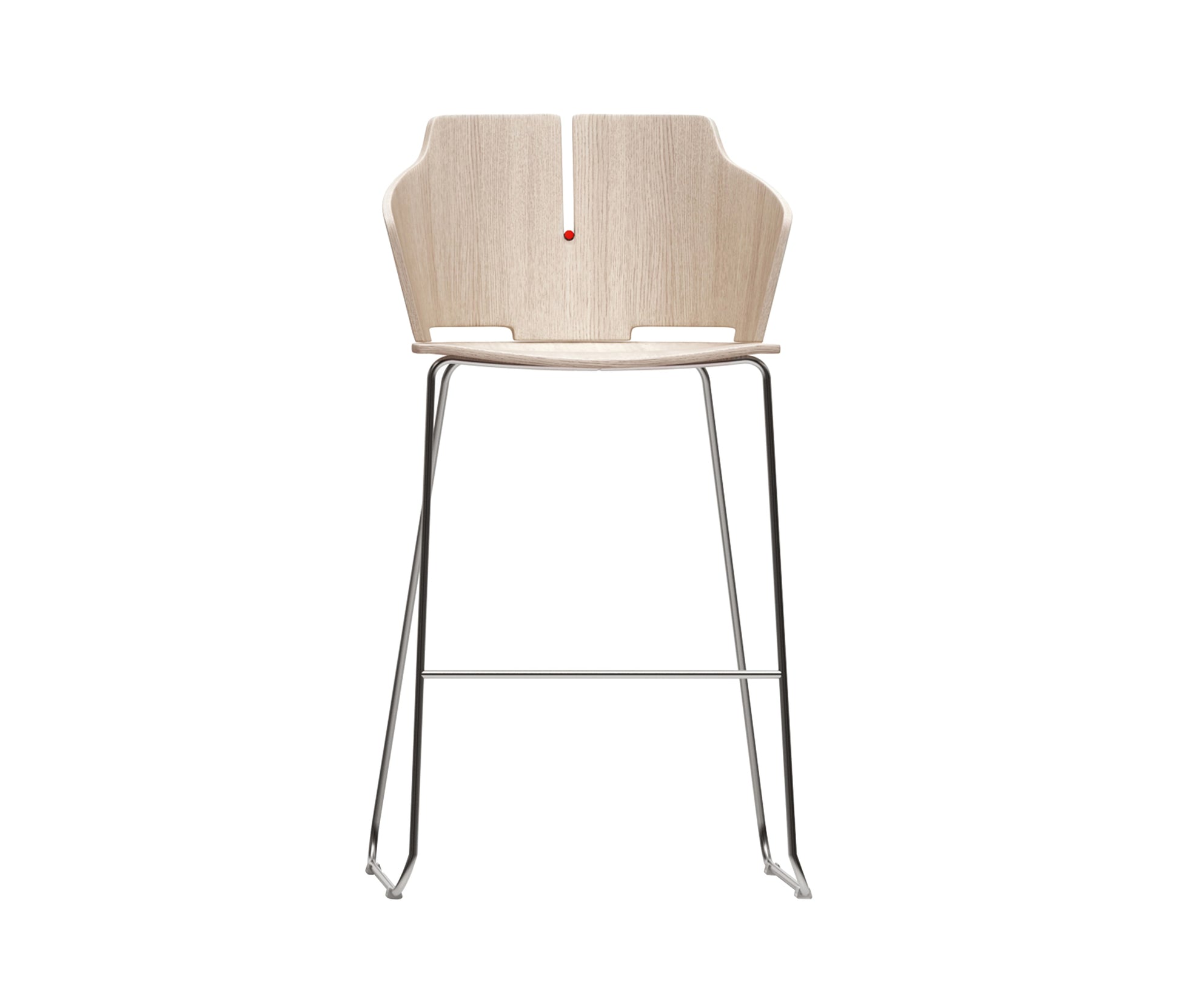 Fix stool with footrest, shell in painted wood, chromed in rod iron cantilever structure.