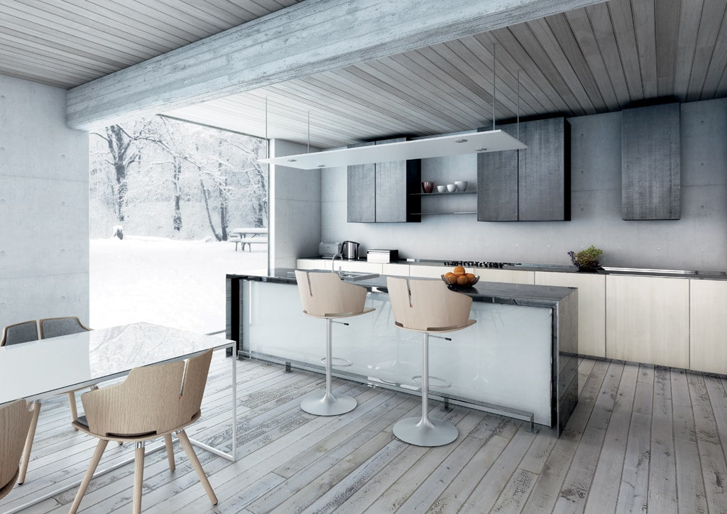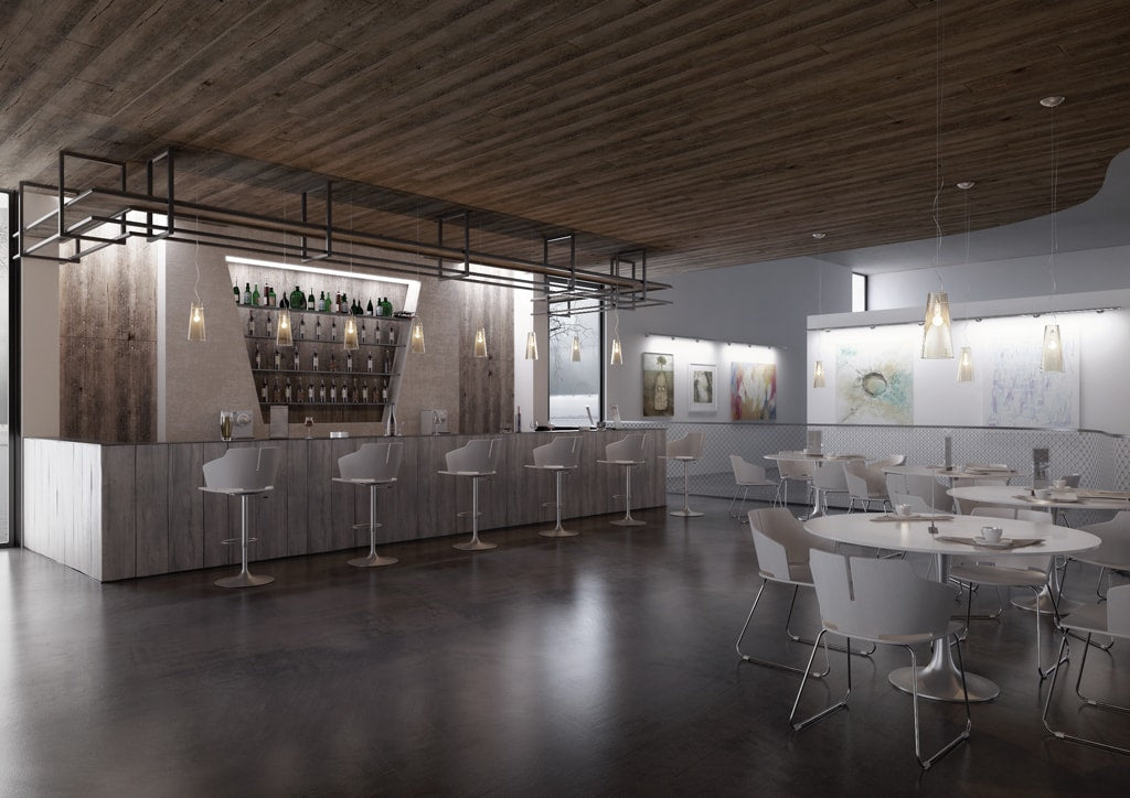 Height adjustable stool, shell in paited wood, footrest and chromed structure, brushed chromed stainless steel base.