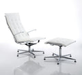Chaise longue, quilted high backrest, with chromed aluminum armrests, fixed height, polished aluminum base.