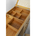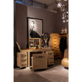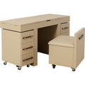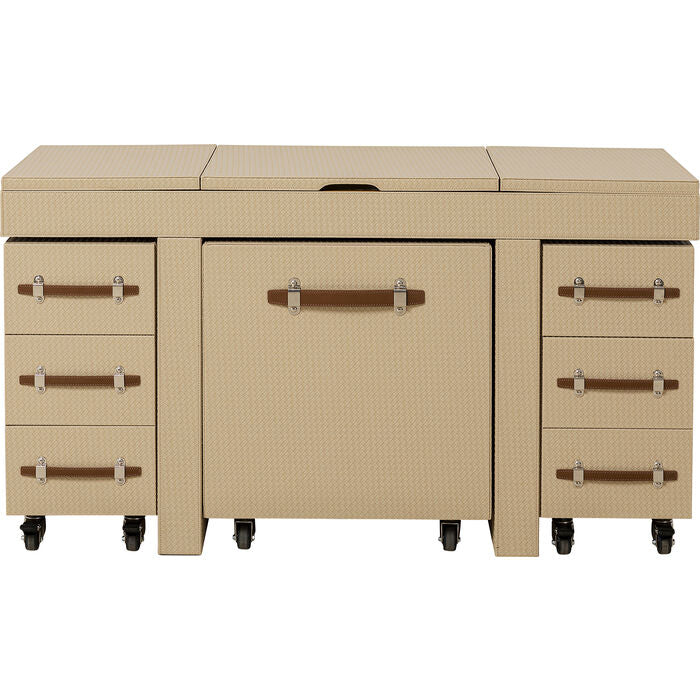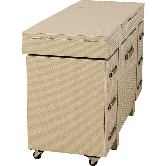 Give your make-up area a new dimension with this mobile dressing table in the warm colour of beige. The elegant dressing table features numerous, functional details. It is sturdily made of medium-density fibreboard covered with a chic wicker-look cover. Other details are created with ash veneer. The dressing table combination is mounted on steel casters so you can move it around easily. This dressing table has its own stool (56x5x46x57cm) which fits completely under the table. There are also two mobile containers with drawers, as well as numerous compartments in the table top to store your makeup and beauty products and other cosmetic utensils in a functional and well-protected way. The surface of the dressing table makes an impact with a classy wicker look, while the easy-care cover made of coated fabric ensures that your will always look as good as new. Be inspired by this dressing table and put on your make-up like a star!