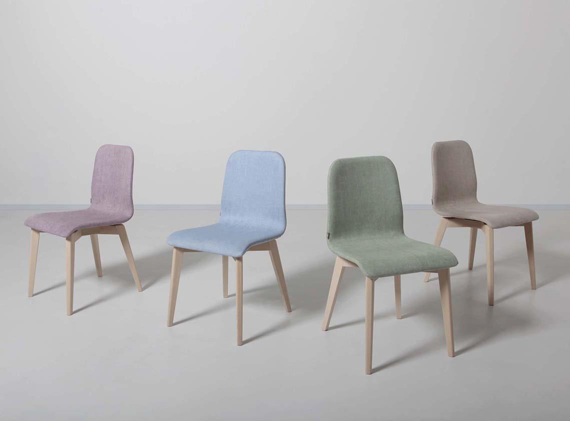 Wooden chair model Hello Wood with structure in beech aniline dyed white lacquered or graphite. The seat and the backrest are upholstered in a faux leather fabric available in various colors or in two types of stain resistant fabric, antibacterial, anallergic: the first, Rally is available in the colours green, pepper, gray, purple and turquoise while the second, Stone, has a similar appearance to canvas and is available in shades of beige, green, jeans and mauve. A chair of very simple design, practical and essential. Designed for those who love traditional chairs in natural wood. A good versatile choice that adapts to a home decor that favors both the classic style as well as a more contemporary look.