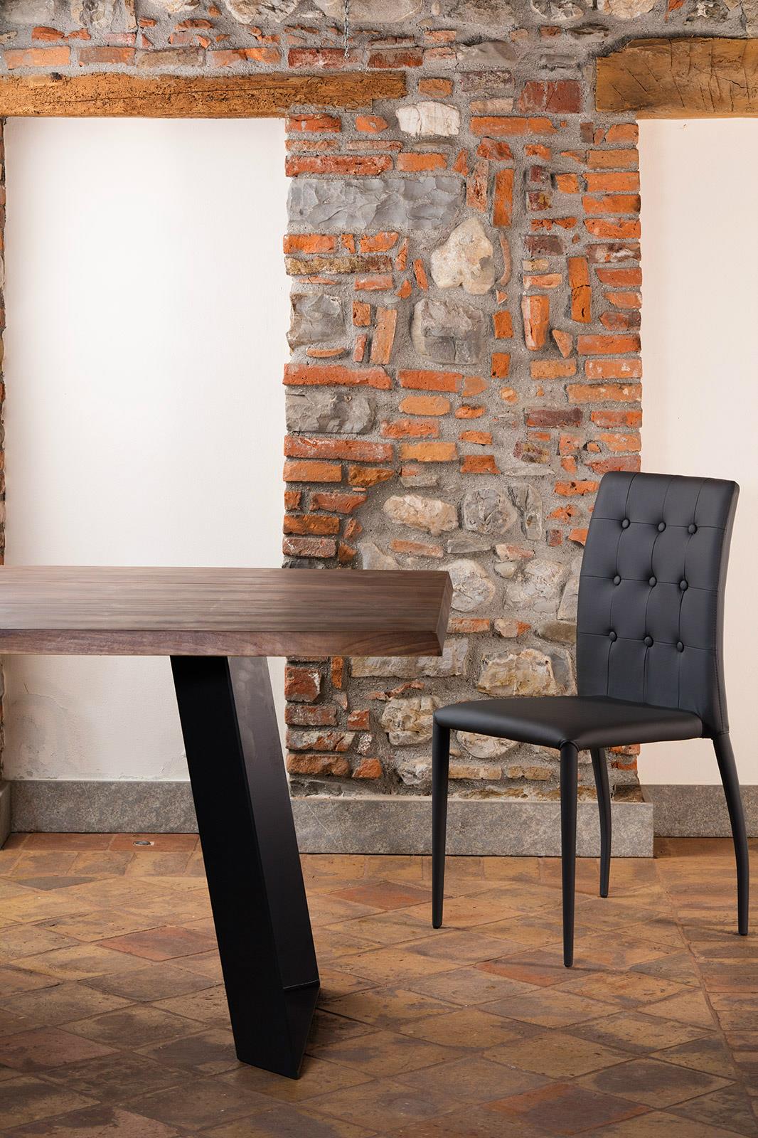 Metal chair fully upholstered model Alba in faux leather in anthracite, white or arena. A stacking chair with a high and slightly curved back which anchors the entire structure and ensure a comfortable, relaxed position. It is also characterized by the quilted lines and nine buttons, also finished in leather, which add a note of elegance, style and originality in product design. The hind legs are curved which with the supporting backrest generates sinuosity and an interesting sense of continuity. It will suit every style, giving any room a classy tone of formality.