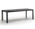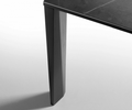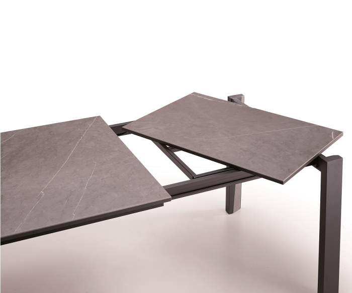 The distinctive element of the Arbok extendable table is the particular shape of the leg, embellished on request with a stoneware insert. The beech or ash wood structure (plus possibly stoneware) supports a top that can be chosen in etched glass or ceramic. Original extension that comes out of the top and rotates, until it is positioned correctly. The frame is made of alumium.