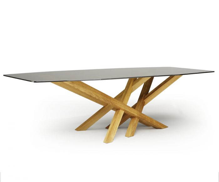 The original shape of the veneered top, also available in glass and stoneware, defines the particular elegance of this table and is lightly combined with the expressive strength of the oak frame, made in different types of finishes. The distinctive element of the table is the particular shape of the structure, embellished upon request by a stoneware insert.