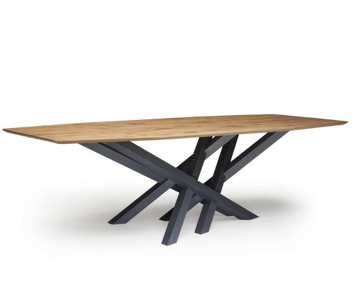 The original shape of the veneered top, also available in glass and stoneware, defines the particular elegance of this table and is lightly combined with the expressive strength of the oak frame, made in different types of finishes. The distinctive element of the table is the particular shape of the structure, embellished upon request by a stoneware insert.