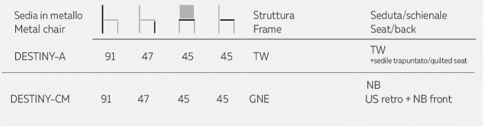In Destiny it is the refined fabrics that make the difference. The choice can fall on two options: the first offers quilted eco-leather in front and smooth back, in the same color, available in four colors: ice, anthracite, mud and forest green; the second is characterized by Nabucco eco-leather and any fabrics of your choice on the back. The legs of the chair are covered in the first version.
