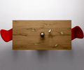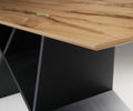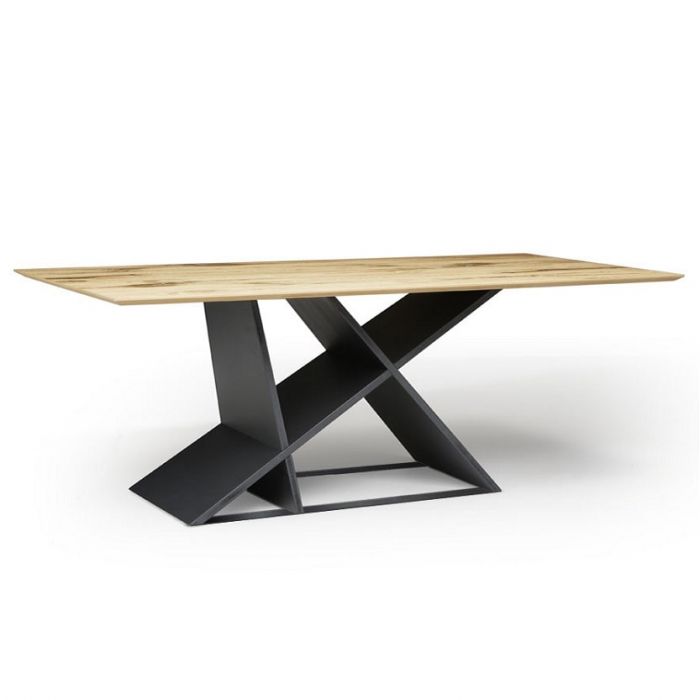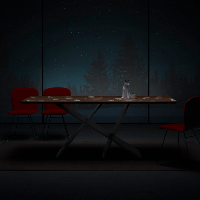 Decisive and essential like a modern sculpture, this table is made with a rectangular veneered top, available in different finishes. The version in knotted oak with resin splits shows all the beauty of living wood, with a decidedly modern style. It can also be chosen in the extendable version.