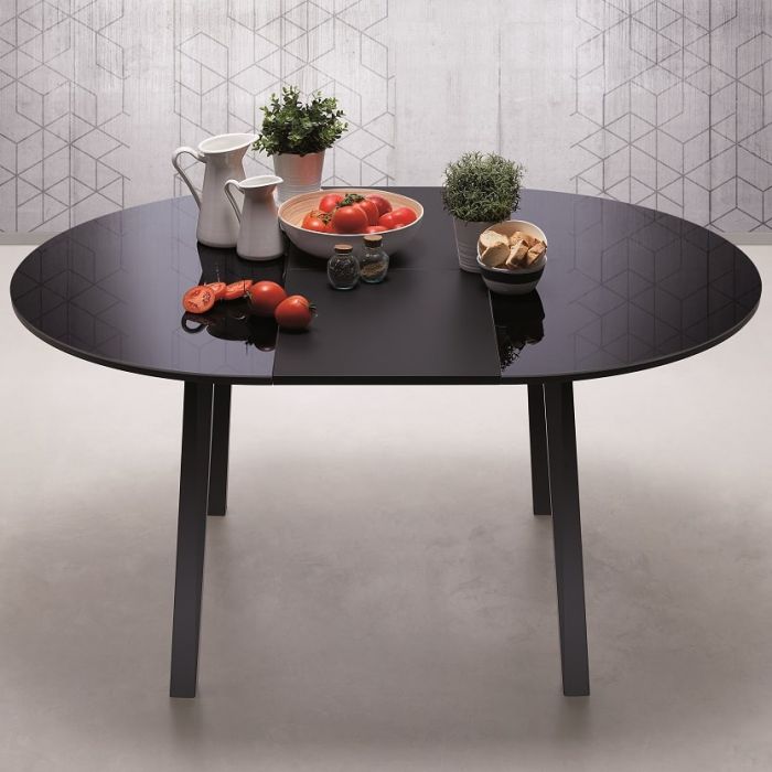 Simple and eclectic, the Hydra Round extendable table can have a round top with a glass or melamine finish. It features inclined beech wood legs. The combination of the glass top with the wooden extension is really impressive.