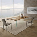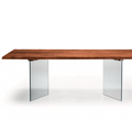 A top that gives the idea of being almost suspended in the air, supported exclusively by two legs in transparent tempered glass that are almost invisible. The glass legs are thin - 1.5 cm - but extremely solid and sturdy, enough to hold the solid wood top. Light as well as being elegant is very functional: it is also available in the extendable version, so as to adapt to any space and need.