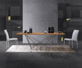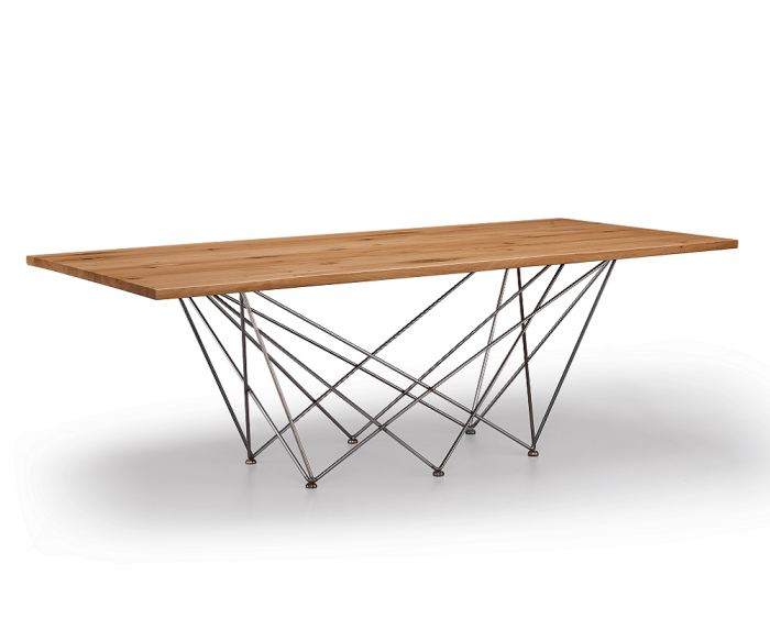 A table in the name of absolute modernity: Net has a base formed by a geometric interweaving of iron rods or painted in gray-black. The top, available in two different sizes, can be chosen in veneer or solid oak.