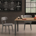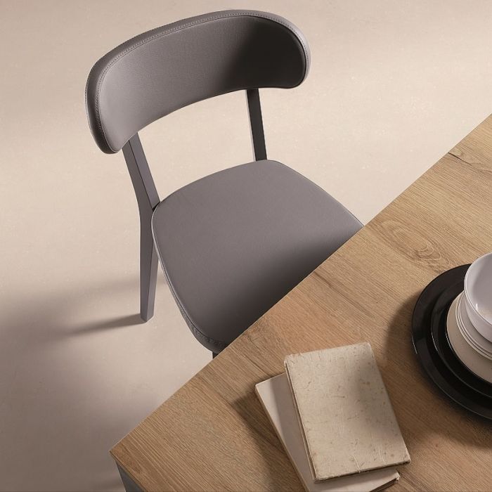 A kitchen chair produced in wood or metal with various finishes and upholstered with trendy fabrics and colors. The shape of the back guarantees a comfortable seat.