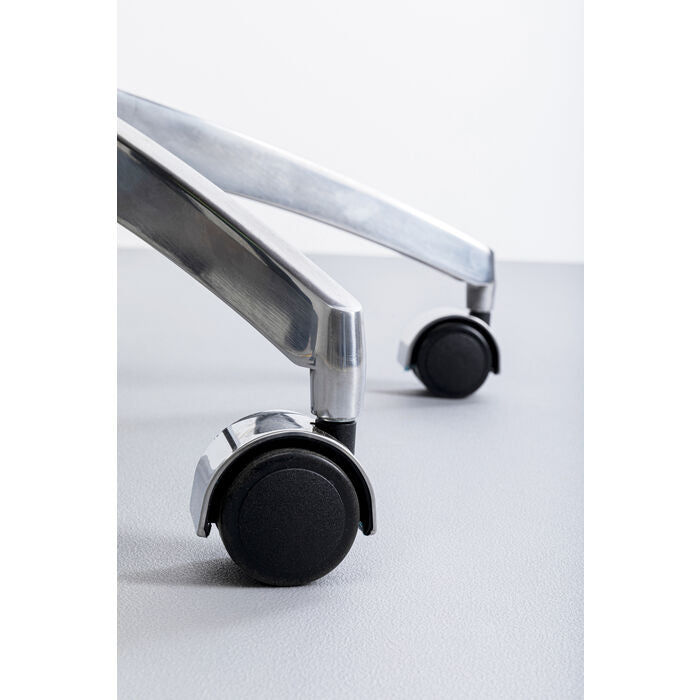 Material: Frame: Steel powder-coated, Cover: Textile polyurethane-coated, Upholstering: 40 kg/m³ Upholstery Foam Polyurethane, Back part: Walnut Plywood Lacquered, Plywood Veneered, Foot/Base: Aluminum polished, 300 kg Max. load-carrying capacity, 45 x 55 cm Adjustable in height, 360 ° Rotable, Rollable, Gas pressure spring, Partly dismantled,