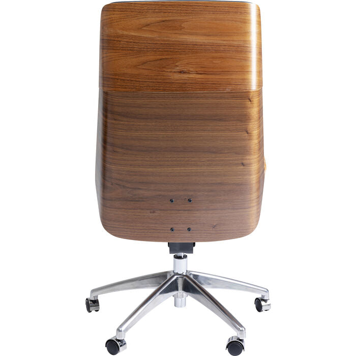 With this wooden office chair the time will definitely fly by in the office. The desk chair can be rotated, tilted and height adjusted. The black cover with the comfortable foam padding and the frame made of powder-coated steel provide the classic image of an office swivel chair. However, from behind it offers a surprise with the back section made of lacquered real walnut veneer, which makes the design office chair extra special and stylish. The seat height is smoothly adaptable and varies between 43-56cm, so you can adjust the office chair without armrests just as you like. In short, this modern chair supports healthy working in the home office and is additionally extra comfortable!