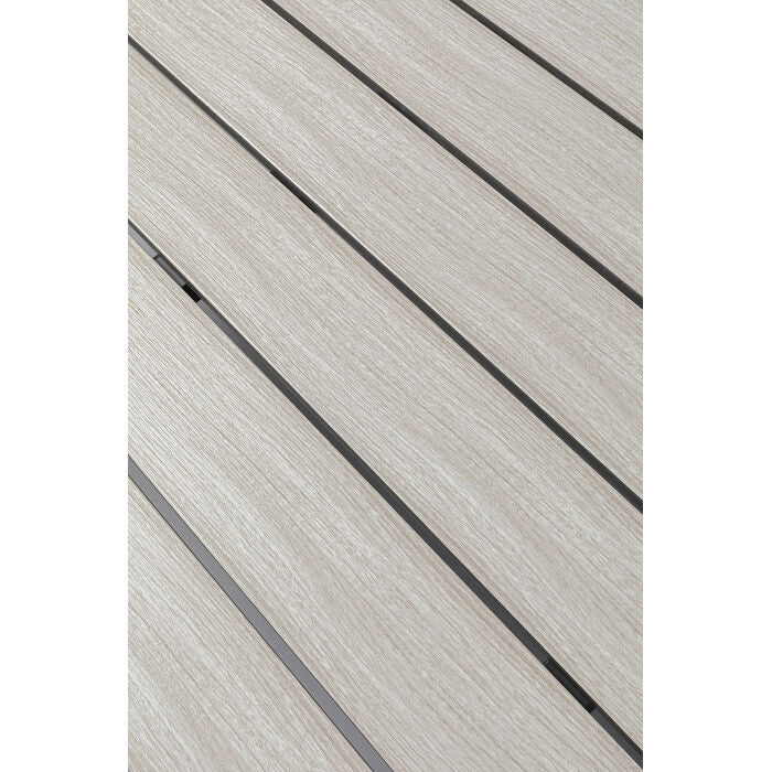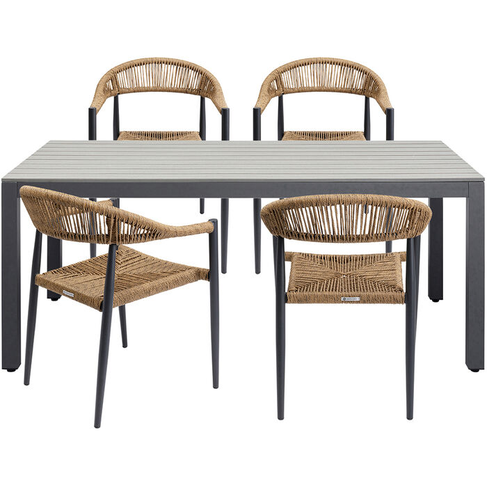 This 5-piece seating group turns any outdoor area into a stylish meeting place. The armchairs in natural tones offer not only comfort but also flexibility thanks to the easy-care wickerwork and lightweight aluminum frame. The table top in an elegant wood look rounds off the natural look perfectly and is also hard-wearing and weatherproof. Whether on the balcony or terrace - this group creates cozy moments that are perfectly set off by cushions, lights or a decorative rug