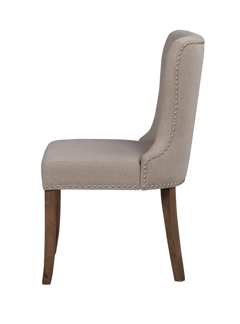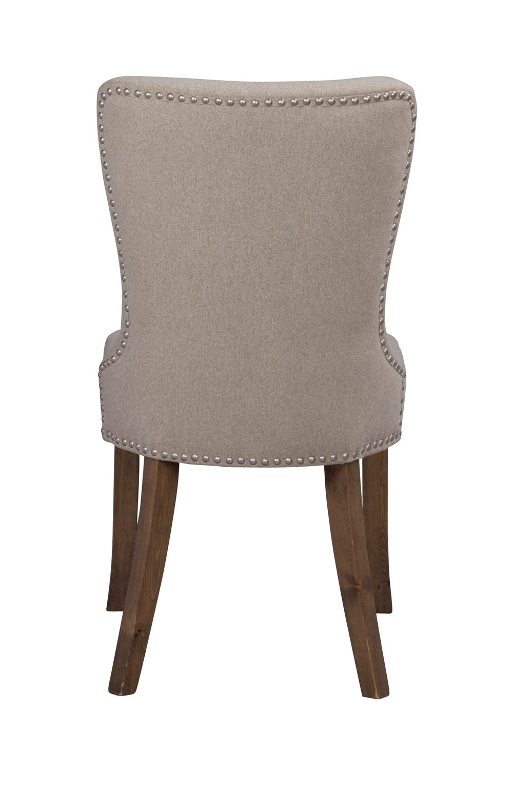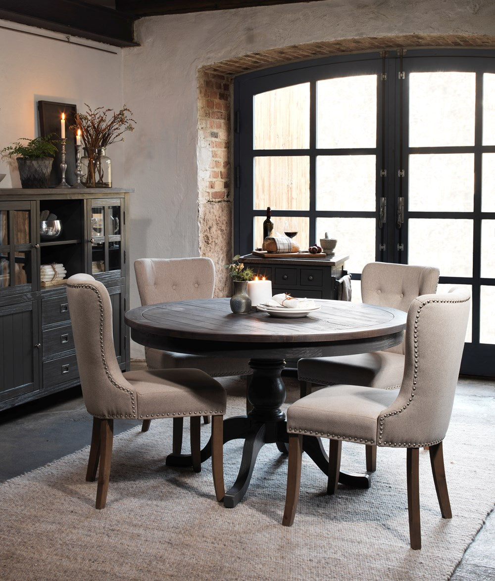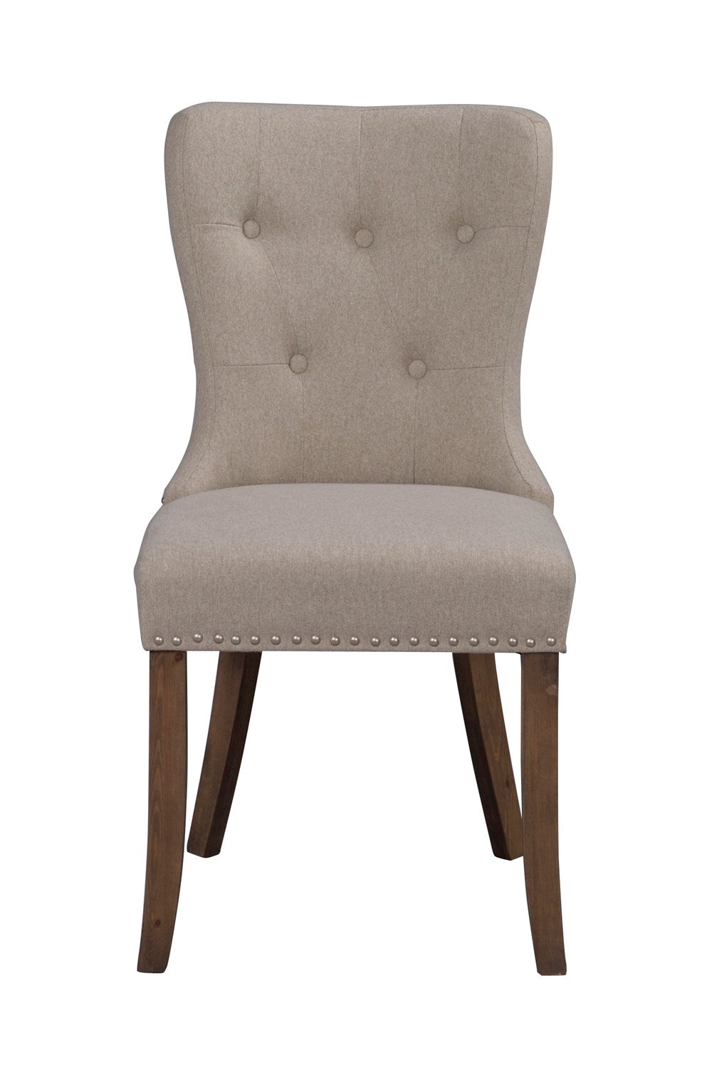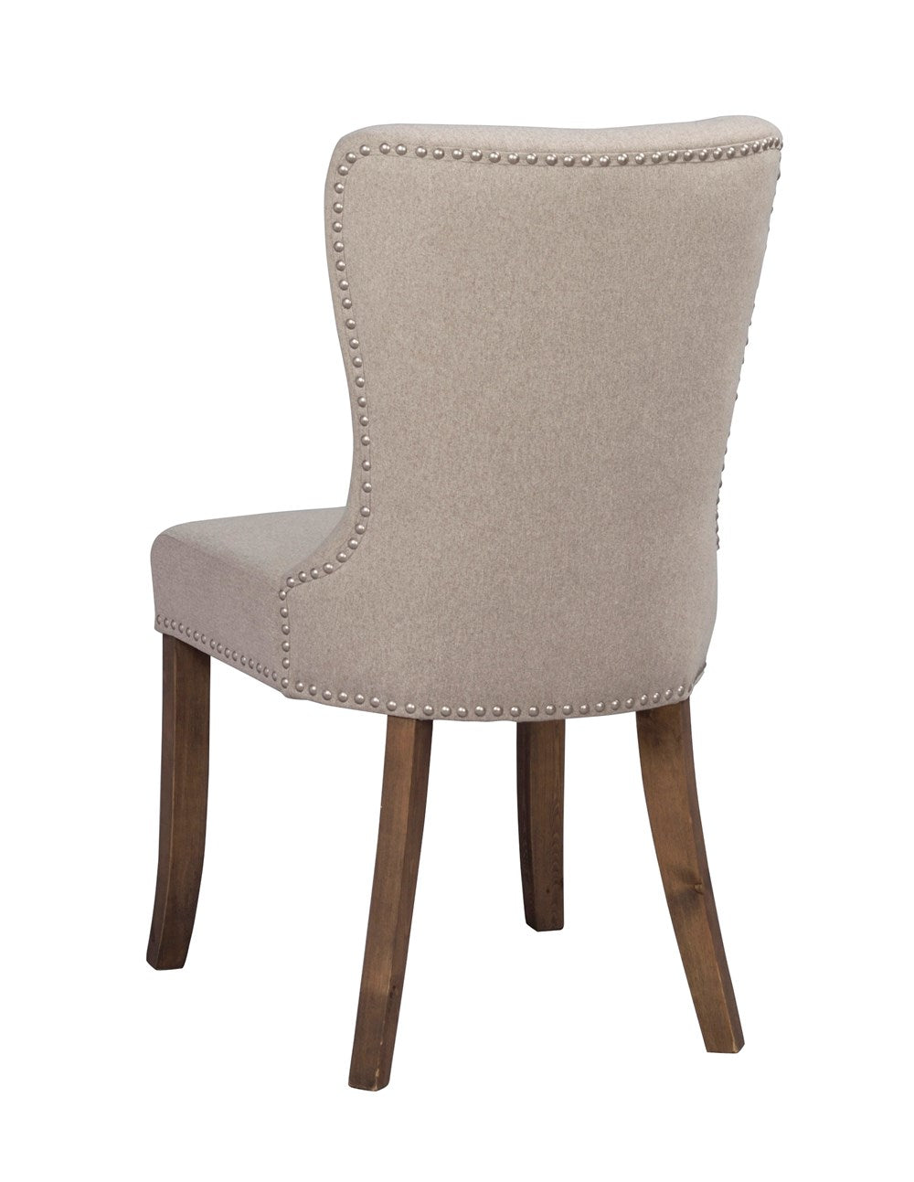 Adele's chair is timeless and elegant. Upholstered seat and lacquered legs in solid larch wood. The seat of the chair in beige fabric has elegant buttons in the back and decorative rivets. Included in our series Adele.