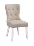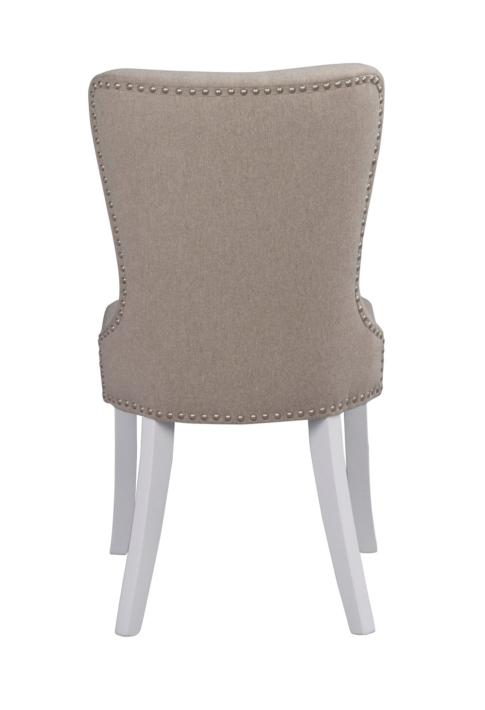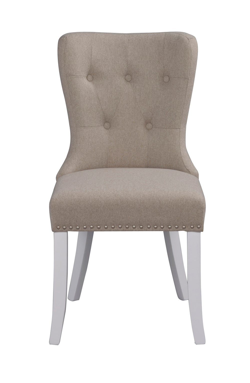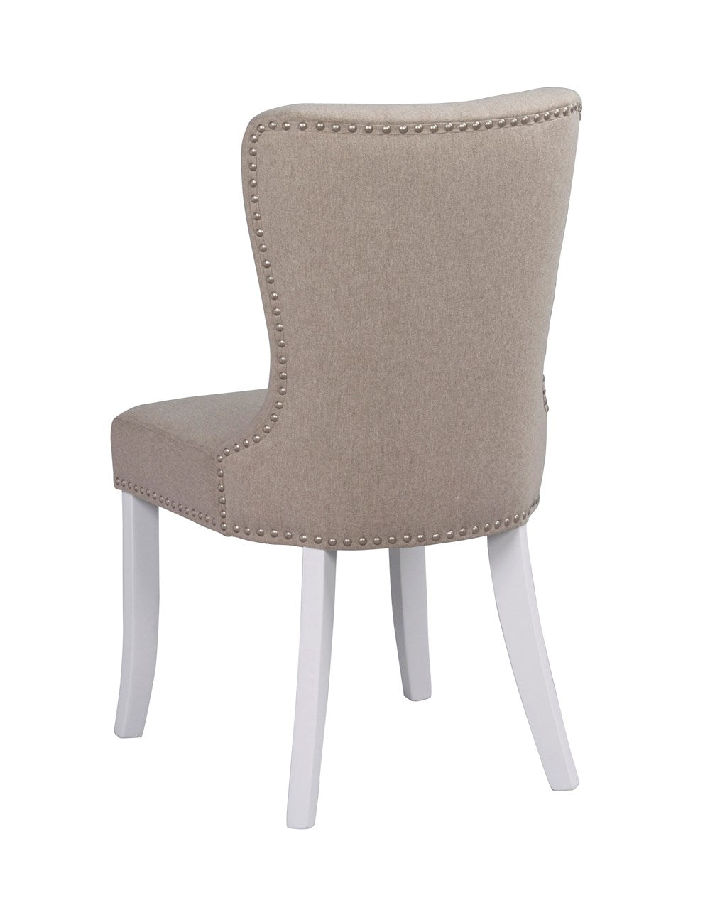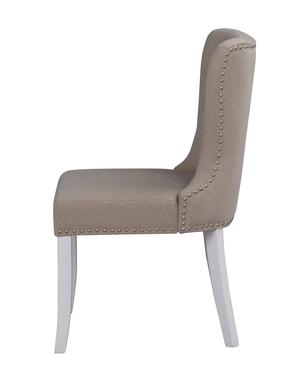 Adele's chair is timeless and elegant. Upholstered seat and white lacquered legs in solid rubber wood. The seat of the chair has elegant buttons in the back and decorative rivets. Included in our series Adele.