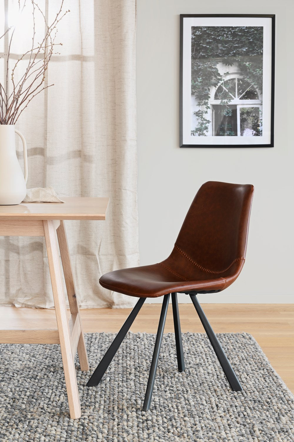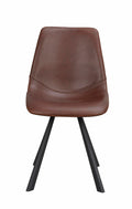 Material: Brown faux leather with decorative stitching. Black powder coated metal legs.