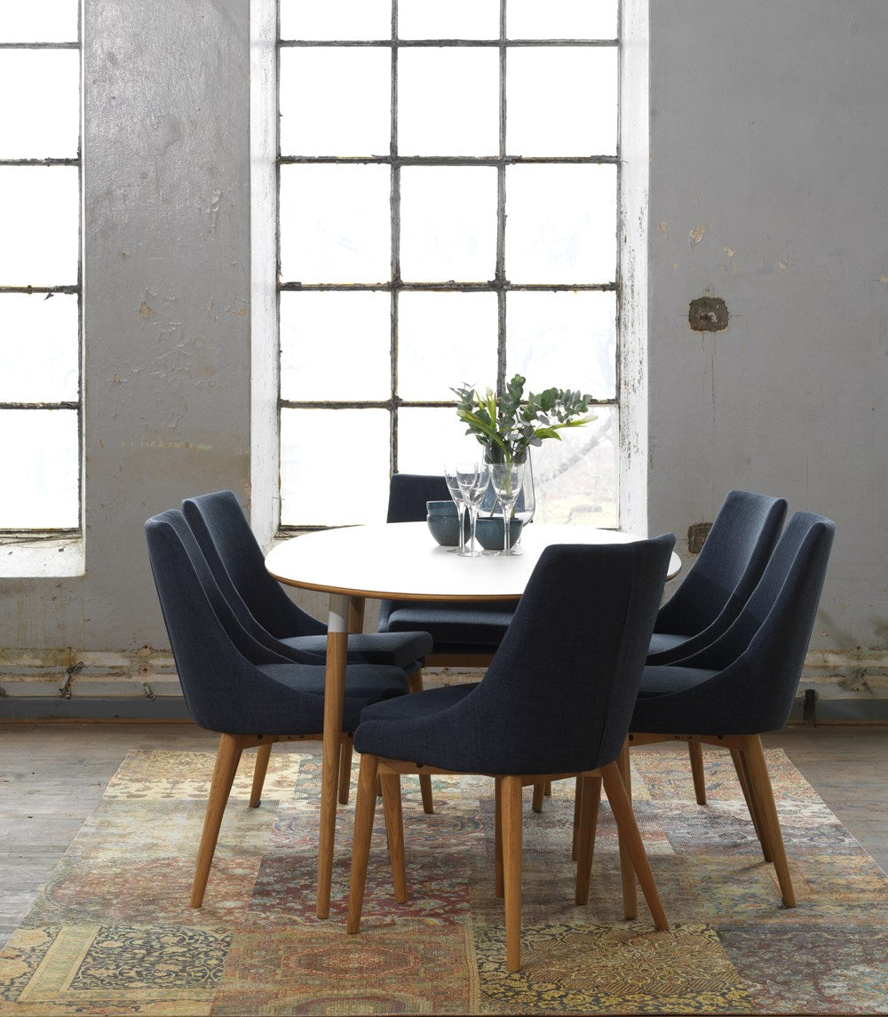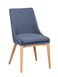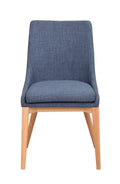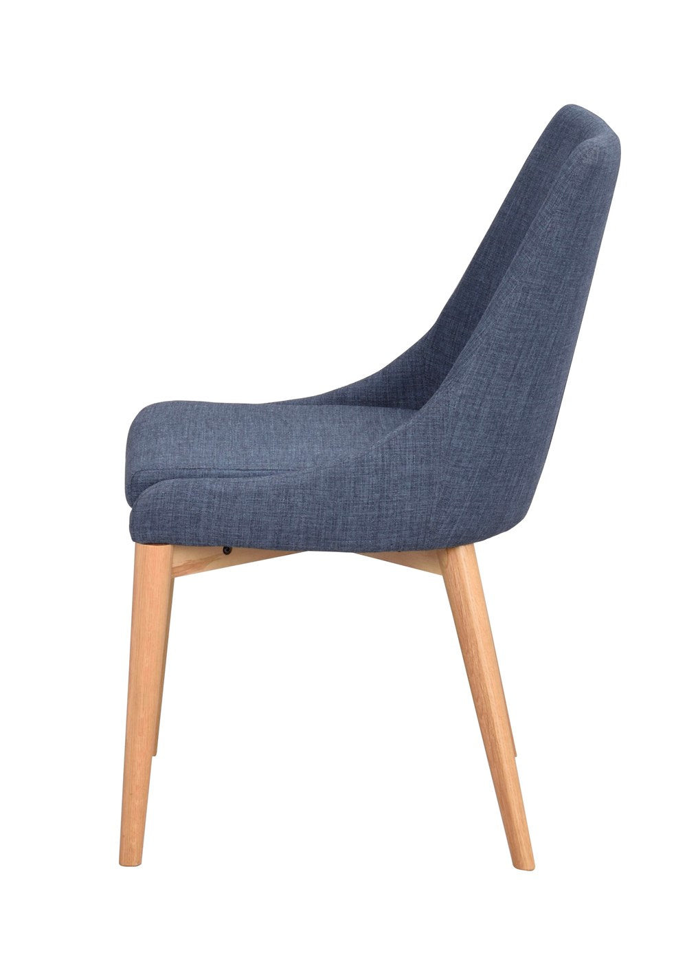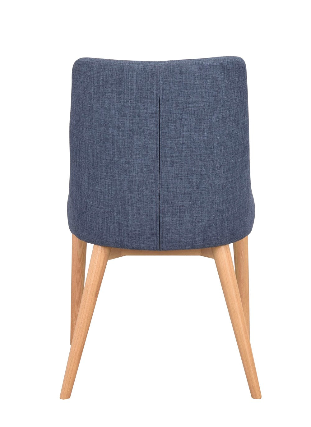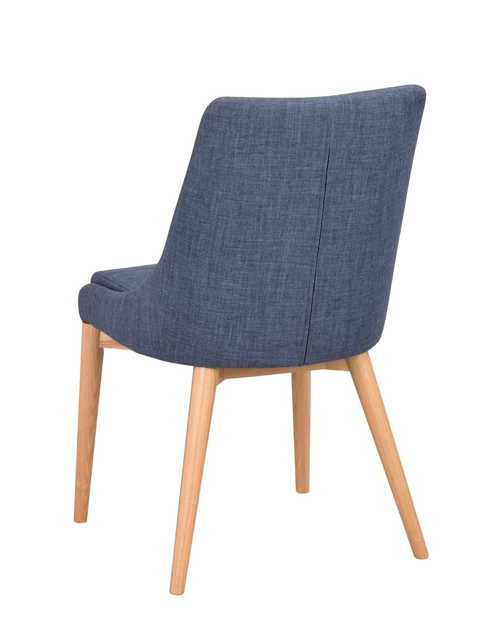 Stylish chair in modern design with upholstered seat in blue fabric and reversible cushion. Legs in lacquered solid oak. The chair is part of our series Bea.