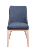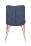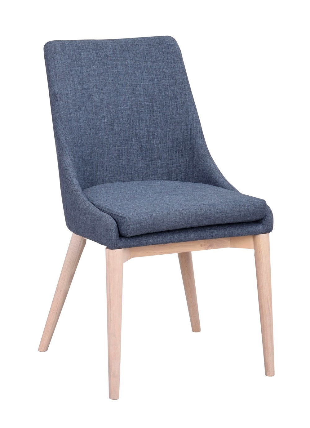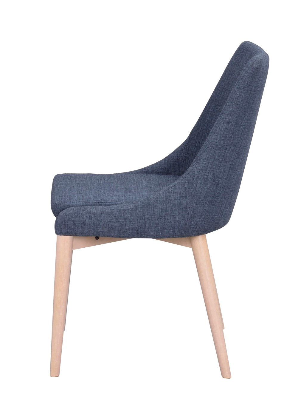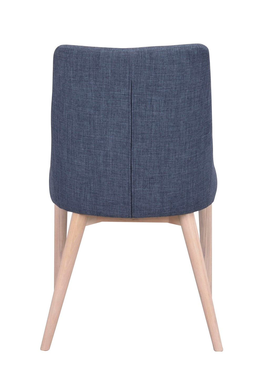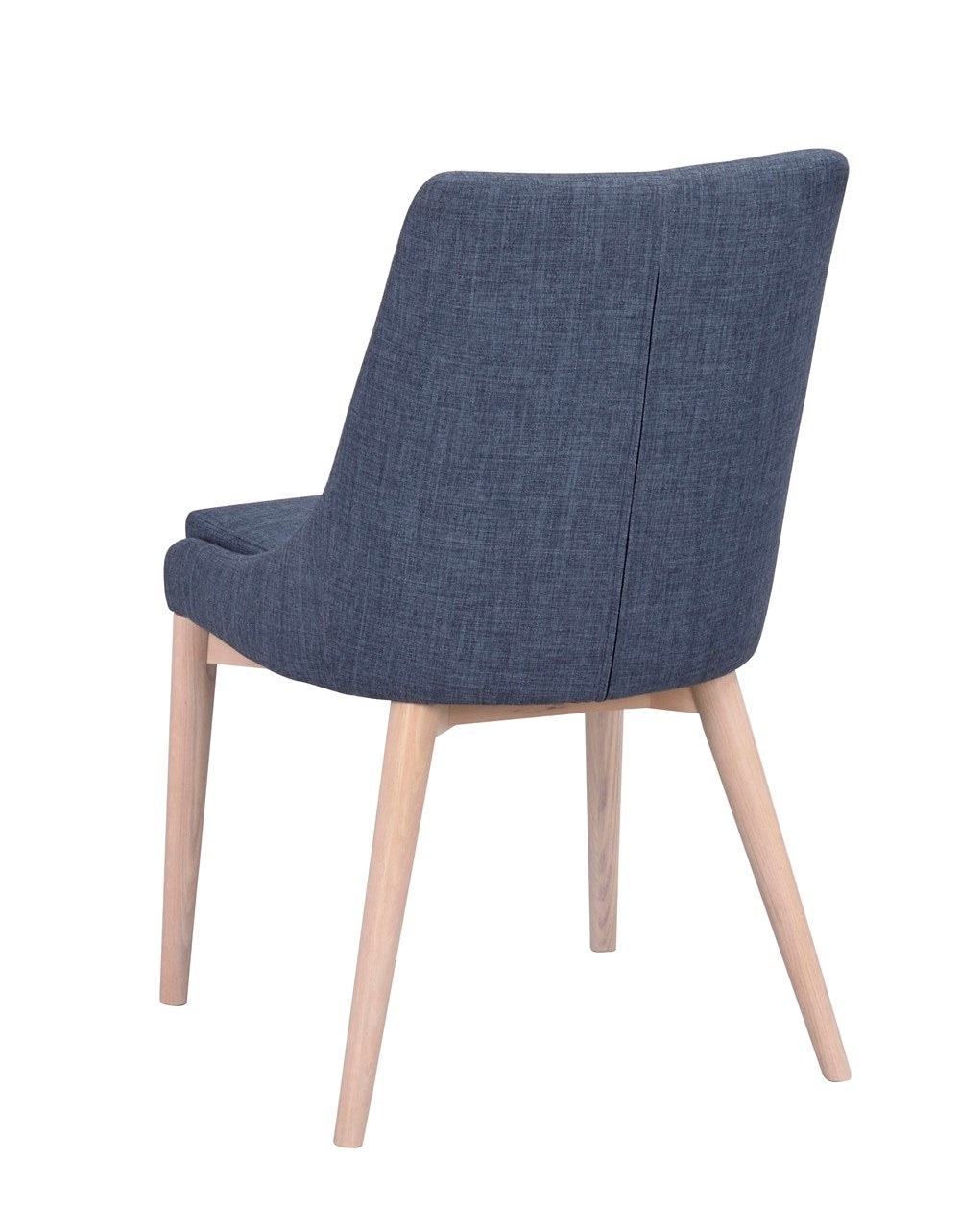 Stylish chair in modern design with upholstered seat in blue fabric and reversible cushion. Legs in lacquered and white pigmented solid oak. The chair is part of our series Bea.