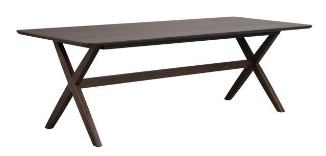 Calverton dining table 230 cm with its unique table legs in solid oak has a high design value. The brown lacquered dining table is modern and fits nicely with both wooden and upholstered chairs and can easily be combined with different interior styles. The table can be supplemented with 1 or 2 additional extensions. The veneered brushed tabletop emphasizes the feeling of wood and fits perfectly in most homes.
