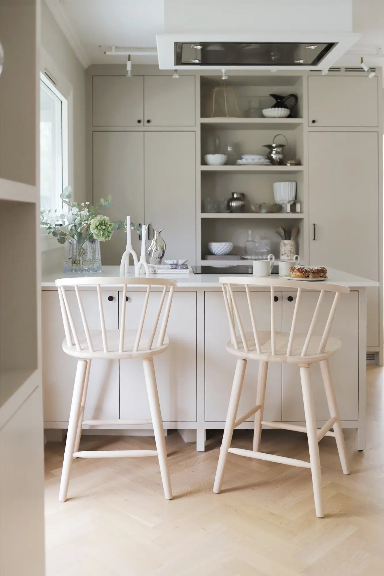 Carmen bar chair with the same wide seating area and curved back as our popular chair with the same name. The chair has a whitewashed lacquered surface that makes it easy to combine with other furniture. Also available in black.