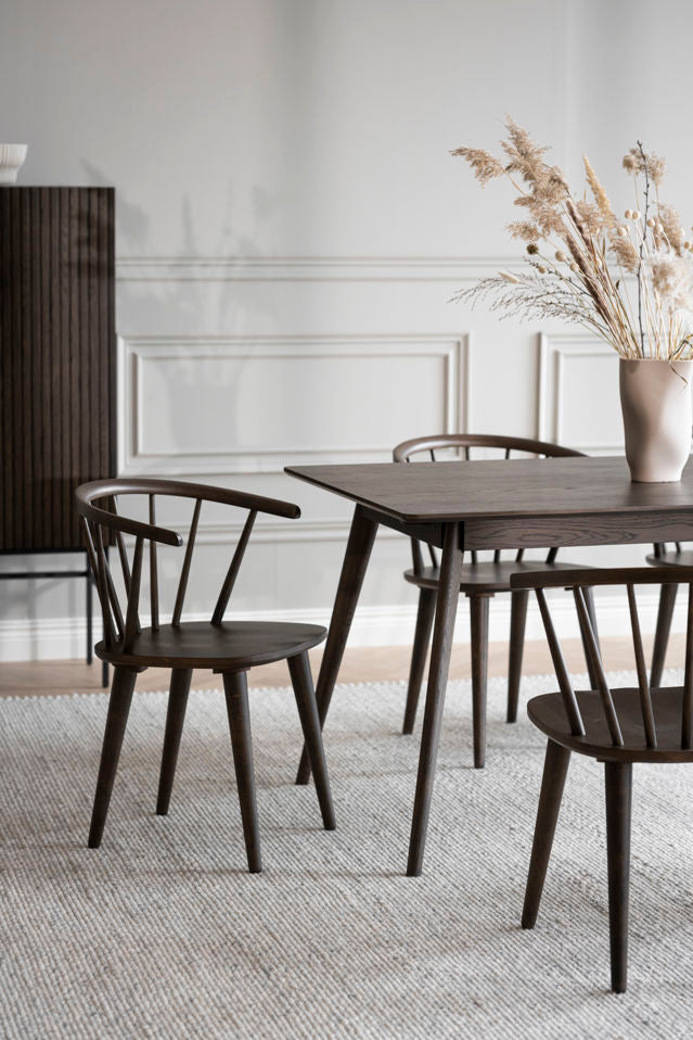 Carmen is an elegantly-shaped, wooden Windsor-type chair. The spindles radiating from the solid seat give the chair stability and presence. A design that works well with many different types of tables in various settings.